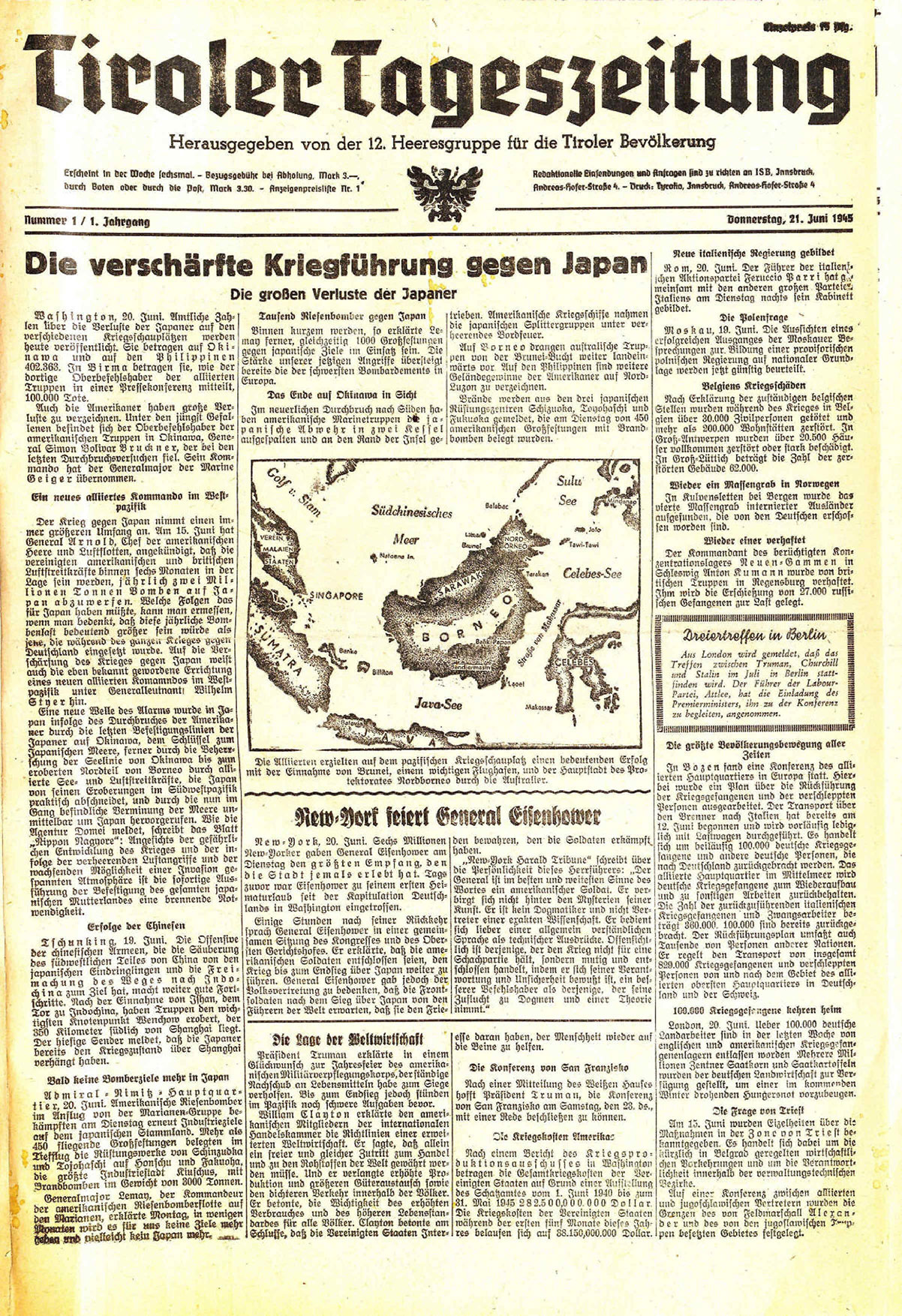 Der Krieg gegen Japan nimmt einen immer größeren Umfang an. Am 15. Juni hat General Arnold, Chef der amerikanischen Heere und Luftflotten, angekündigt, daß die vereinigten amerikanischen und britischen Luftstreitkräfte binnen sechs Monaten in der Lage sein werden, jährlich zwei Millionen Tonnen Bomben auf Japan abzuwerfen. Welche Folgen das für Japan haben müßte, kann man ermessen, wenn man bedenkt, daß diese jährliche Bombenlast bedeutend größer sein würde als
