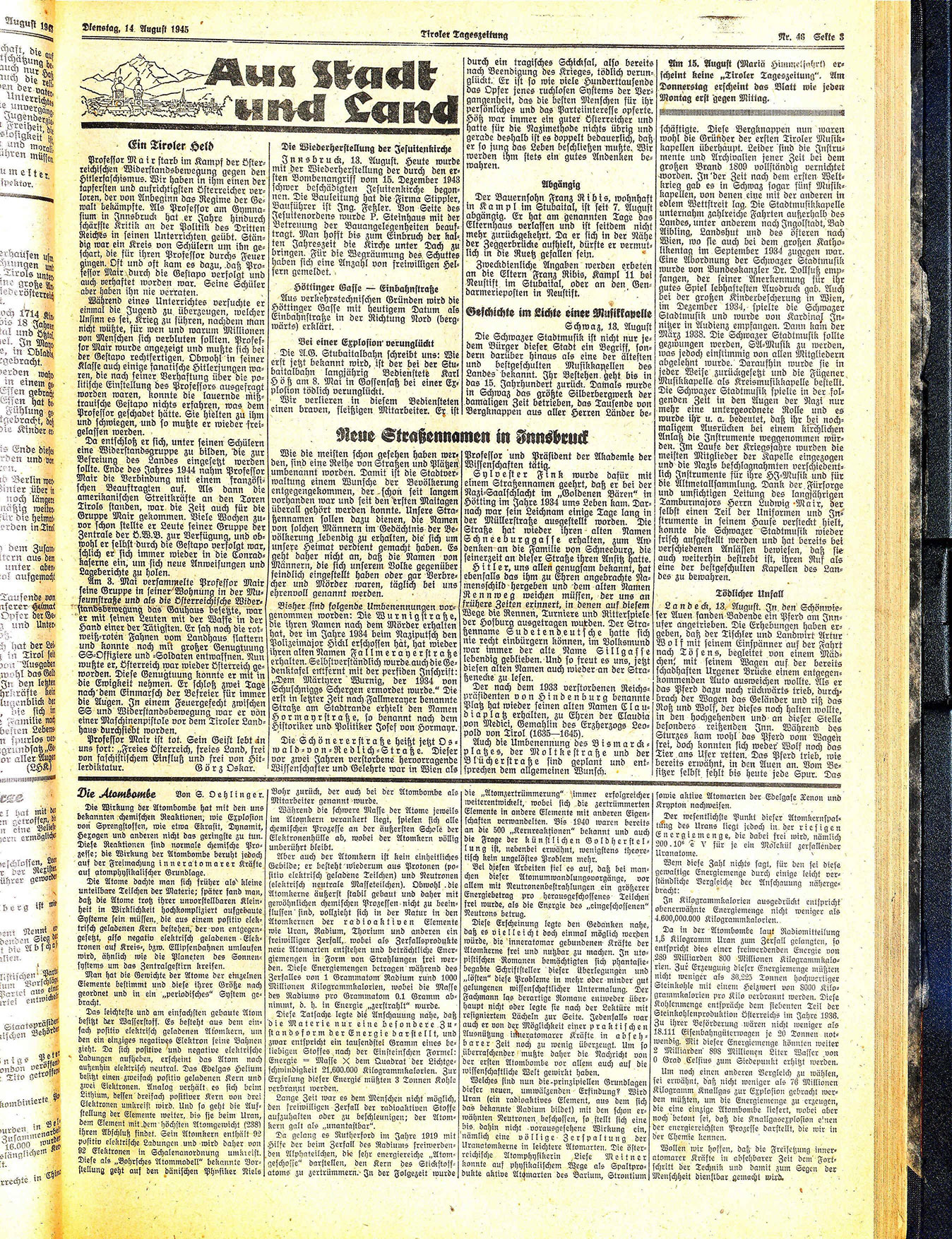 Professor Mair starb im Kampf der österreichischen Widerstandsbewegung gegen den Hitlerfaschismus. Wir haben in ihm einen der tapfersten und aufrichtigsten Österreicher verloren, der von Anbeginn das Regime der Gewalt bekämpfte. Als Professor am Gymnasium in Innsbruck hat er Jahre hindurch schärfste Kritik an der Politik des Dritten Reiches in seinen Unterrichten geübt. Ständig war ein Kreis von Schülern um ihn geschart, die für ihren Professor durchs Feuer gingen. Oft und oft kam es dazu, daß Professor Mair durch die Gestapo verfolgt und auch verhaftet worden war. Seine Schüler aber haben ihn nie verraten.