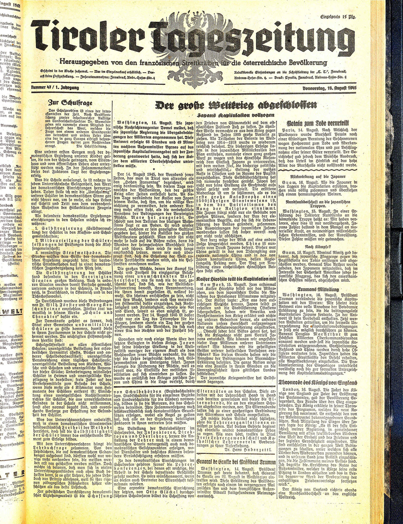 Der 14. August 1945, der Vorabend jenes Festes, das man in Tirol von altersher als den „Hohen Frauentag“ bezeichnet, wird ewig denkwürdig sein. An diesem Tage verrauschte der Waffenlärm, den der größte Krieg aller Zeiten entfesselt hatte. An diesem Tage verkündete der Kaiser von Japan seinem Volke, daß ihm, um die völlige Vernichtung zu vermeiden, kein anderer Ausweg mehr offen steht, als die vorbehaltlose Annahme der Bedingungen der Vereinigten Mächte. Mars hat ausgetobt. Erschöpft von den Delirien des blutigen Wahnsinns liegt er am Boden. Er wird wieder einmal, nachdem er sein grausigstes Gastspiel gegeben hat, hinter die Kulissen des großen Welttheaters geschleift. Man wird ihn nicht mehr so bald auf die Bühne rufen, denn die Wunden der