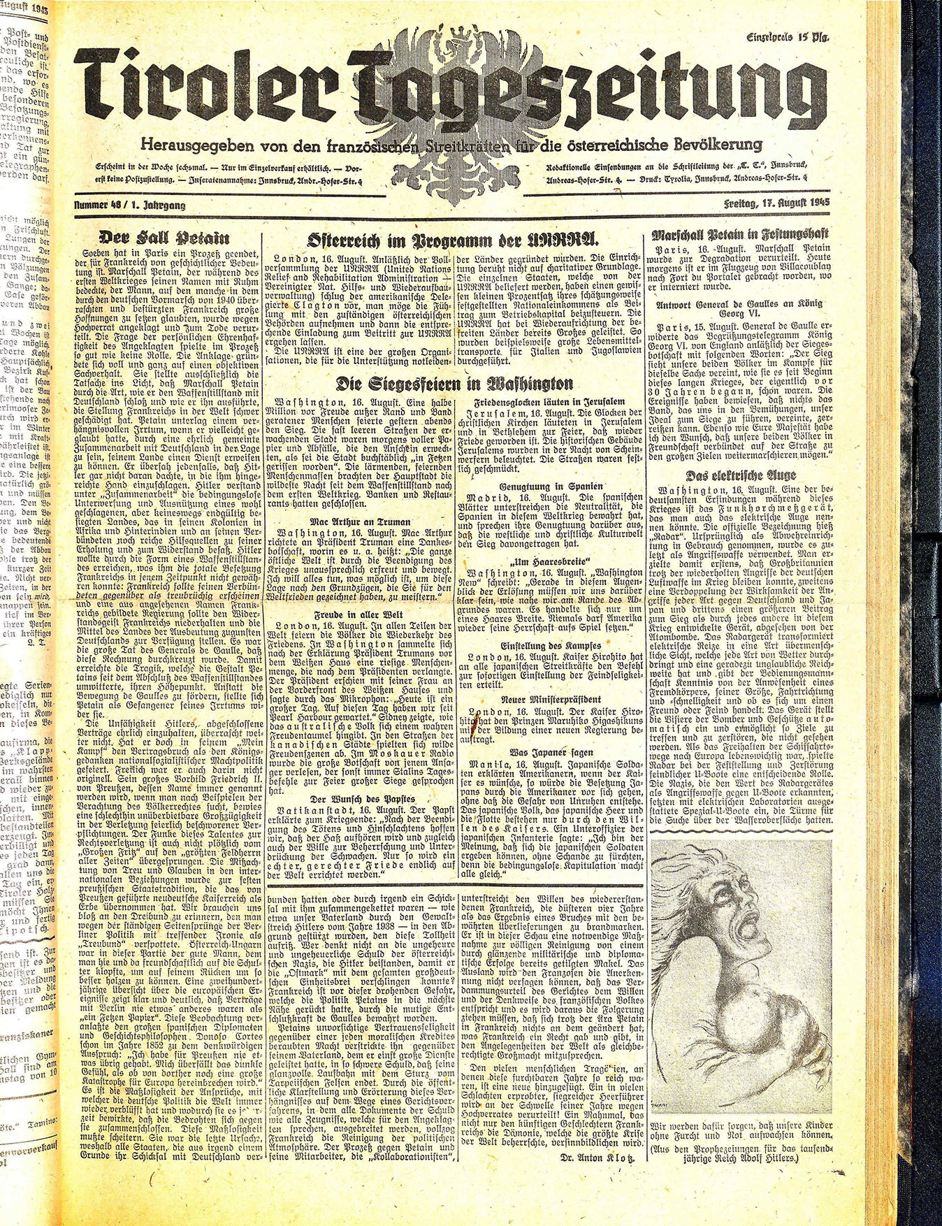 Erscheint in der Woche sechsmal. — Nur im Einzelverkauf erhältlich. — Vorerst keine Postzustellung. — Inseratenannahme: Innsbruck, Andr.-Hofer-Str. 4