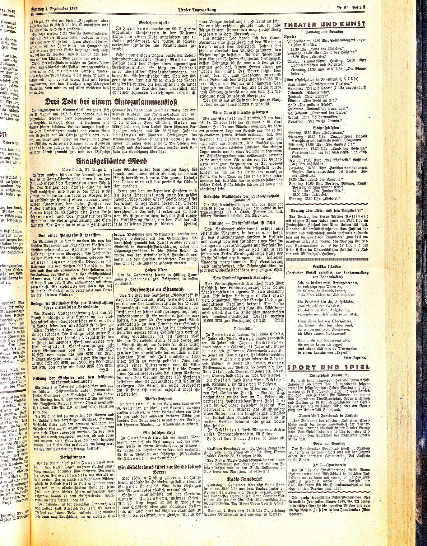 Das Landesgesundheitsamt erläßt eine öffentliche Warnung, in der es u. a. heißt: In den Umbruchstagen wurden in Kufstein und Wörgl von den Insassen eines Ausländerlagers mehrere Waggons mit Methylalkohol geplündert. In letzter Zeit sind in verschiedenen Teilen Tirols zahlreiche Fälle von Methylalkoholvergiftungen mit tödlichem Ausgang vorgekommen. Dig Bevölkerung wird aufgefordert, alle Schwarzhändler sofort der Sicherheitsbehörde anzuzeigen. LHK.