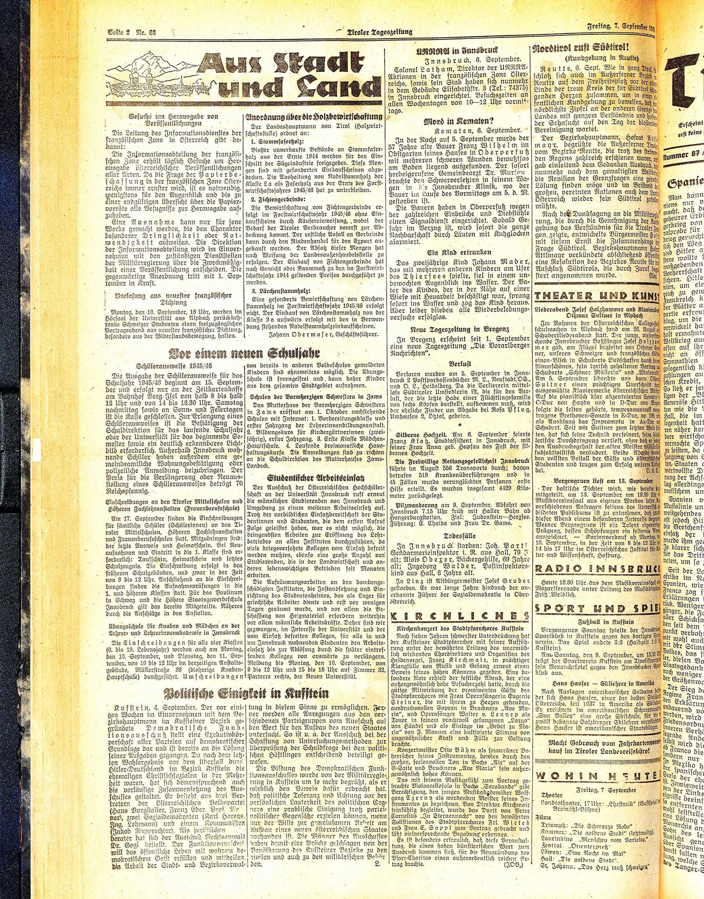 Am 17. September finden die Einschreibungen für sämtliche Schüler (Schülerinnen) an den Tiroler Mittelschulen, Höheren Fachlehranstalten und Frauenberufsschulen statt. Mitzubringen sind: der letzte Ausweis und Heimatschein. Bei Neuaufnahmen und Eintritt in die 1. Klasse sind erforderlich: Taufschein, Heimatschein und letztes Schulzeugnis. Die Einschreibung erfolgt in den früheren Schulgebäuden, und zwar in der Zeit von 8 bis 12 Uhr. Anschließend an die Einschreibungen finden die Aufnahmsprüfungen in die 1. und höheren Klassen statt. Für das Paulinum in Schwaz und die Höhere Staatsgewerbeschule Innsbruck gilt das bereits Mitgeteilte. Näheres durch die Anschläge in den Anstalten.