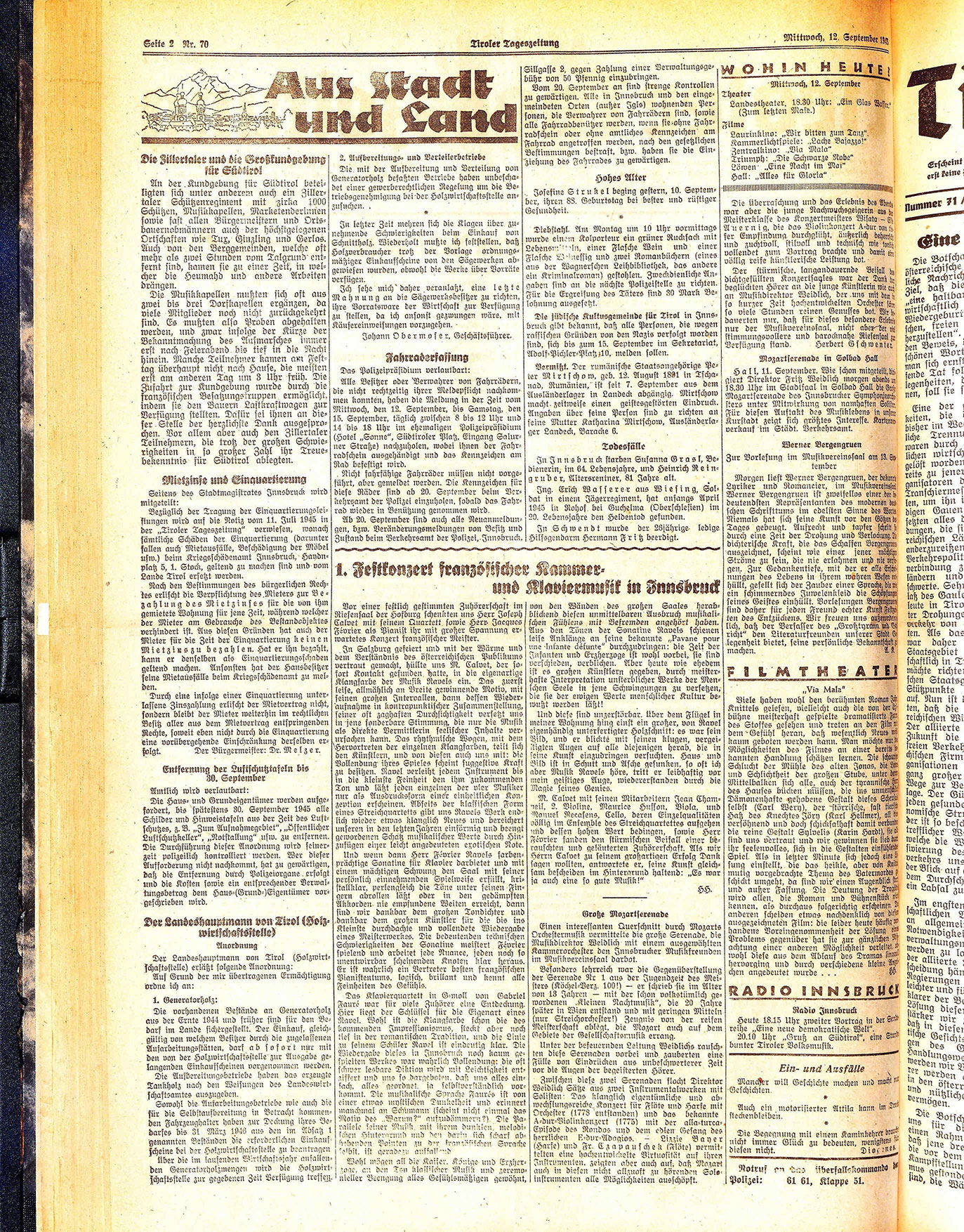 Hall, 11. September. Wie schon mitgeteilt, di giert Direktor Fritz Weidlich morgen abend18.30 Uhr im Stadtsaal in Solbad Hall die Gus Mozartserenade des Innsbrucker Symphonjeot sters unter Mitwirkung von namhaften Soliste Für diesen Auftakt des Musiklebens in unse Kurstadt zeigt sich größtes Interesse. Kartems verkauf im Städt. Verkehrsamt.
