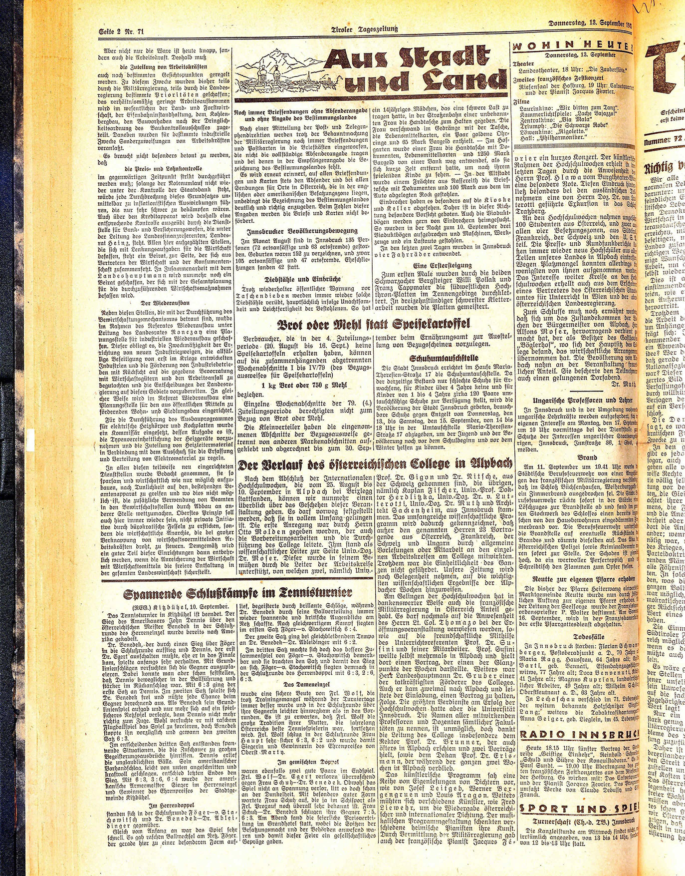 Im Monat August sind in Innsbruck 135 Personen (72 ortsansässige und 63 ortsfremde) gestorben. Geburten waren 152 zu verzeichnen, und zwar 105 ortsansässige und 47 ortsfremde. Eheschließungen fanden 42 statt.