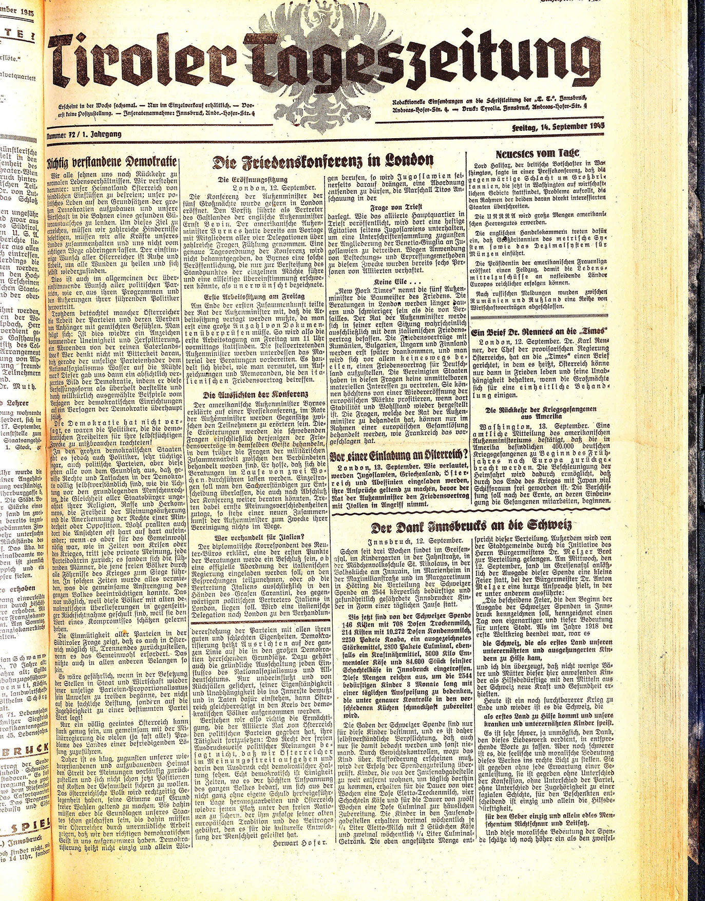 „Die bescheidene Feier, die den Beginn der Ausgabe der Schweizer Spenden in Innsbruck kennzeichnen soll, kennzeichnet einen Tag von eigenartiger und tiefer Bedeutung für unsere Stadt. Als im Jahre 1918 der erste Weltkrieg beendet war, war es die Schweiz, die als erstes Land unseren unterernährten und ausgehungerten Kindern zu Hilfe kam,