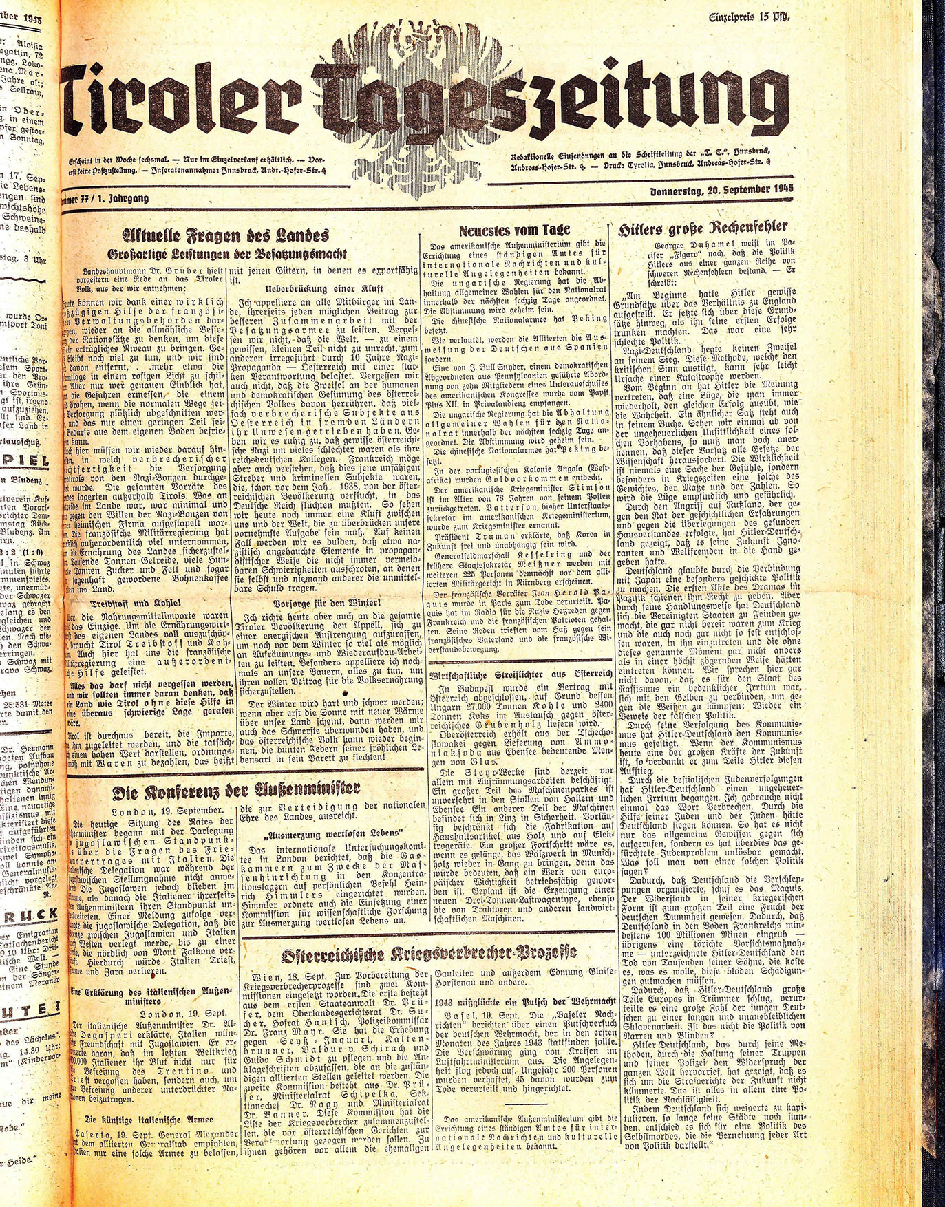 sich hier müssen wir wieder darauf hinsen, in welch verbrecherischer ichtfertigkeit die Versorgung ktirols von den Nazi=Bonzen durchge wurde. Die gesamten Vorräte des lagerten außerhalb Tirols. Was an eide im Lande war, war minimal und igegen den Willen der Nazi=Bonzen von per heimischen Firma aufgestapelt worin Die französische Militärregierung hat #tlch außerordentlich viel unternommen,