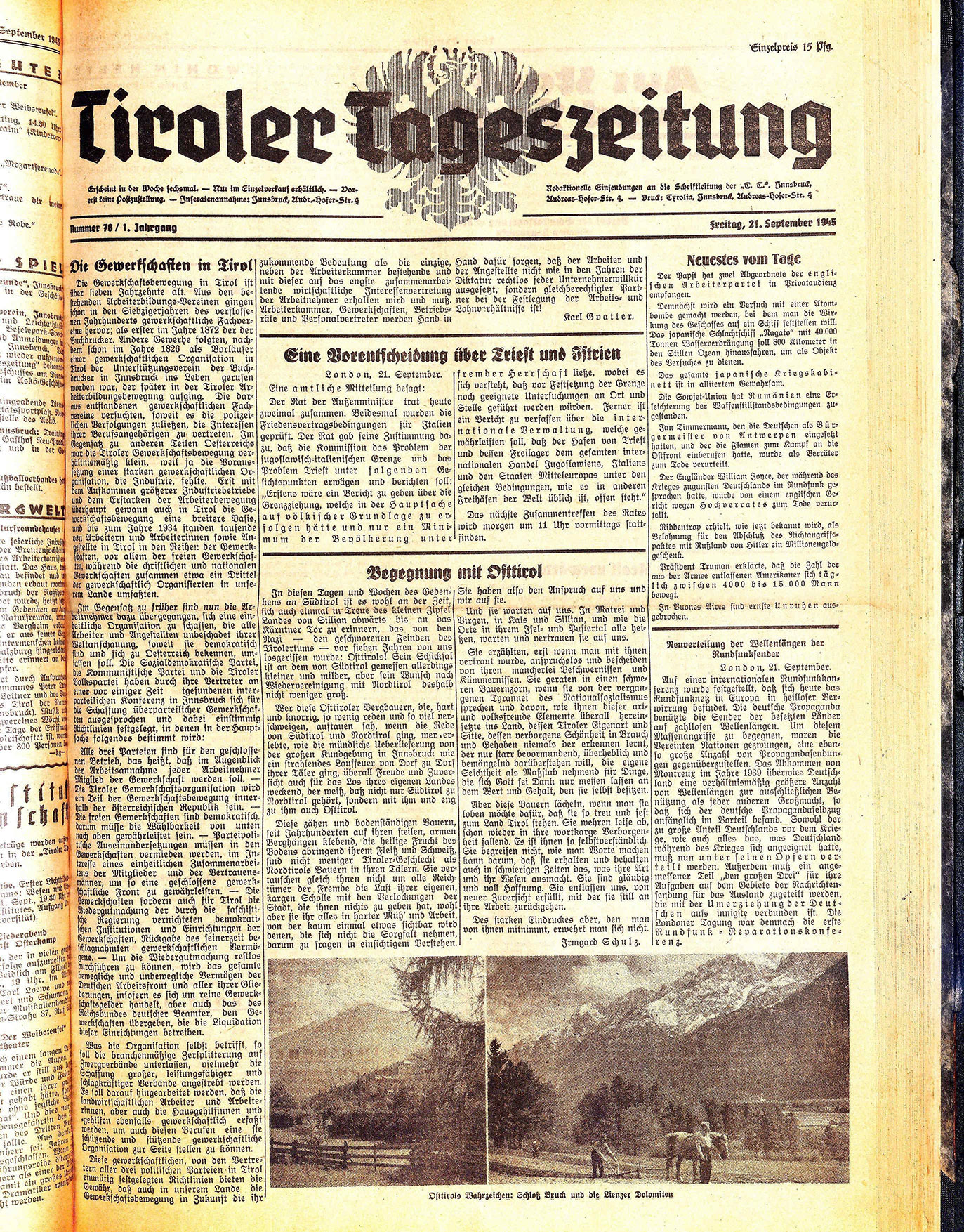 In diesen Tagen und Wochen des Gedenkens an Südtirol ist es wohl an der Zeit, sich auch einmal in Treue des kleinen Zipfel Landes von Sillian abwärts bis an das Kärntner Tor zu erinnern, das von den Nazi — den geschworenen Feinden des Tirolertums — vor sieben Jahren von uns losgerissen wurde: Osttirols! Sein Schicksal ist an dem von Südtirol gemessen allerdings kleiner und milder, aber sein Wunsch nach Wiedervereinigung mit Nordtirol deshalb nicht weniger groß.