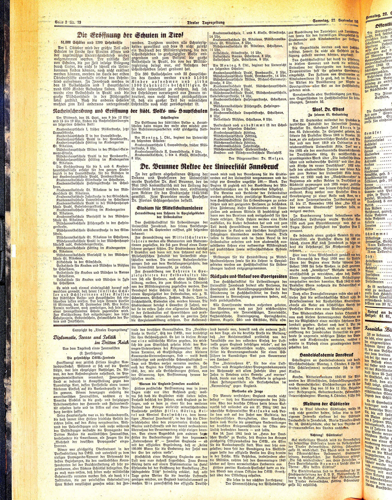 Am 1. Oktober wird der größte Teil aller Schulen im Lande ihre Pforten öffnen und der regelmäßige Unterrichtsbetrieb wieder aufgenommen werden. Der restliche Teil von Schulen, die zur Zeit infolge Belegung durch Amter, die nicht so schnell ein Unterkommen finden können, noch nicht eröffnet werden können, werden im Laufe der ersten Oktoberhälfte ebenfalls wieder den Lehrbetrieb aufnehmen. In Innsbruck werden in den 18 Volksschulen und 7 Hauptschulen rund 6000 Kinder Aufnahme finden. Leider wurde eine Volksschule in Pradl und die große Mädchenschule in der Fischergasse total zerstört. Auch die anderen Schulen mußten zum Teil anderswo untergebracht