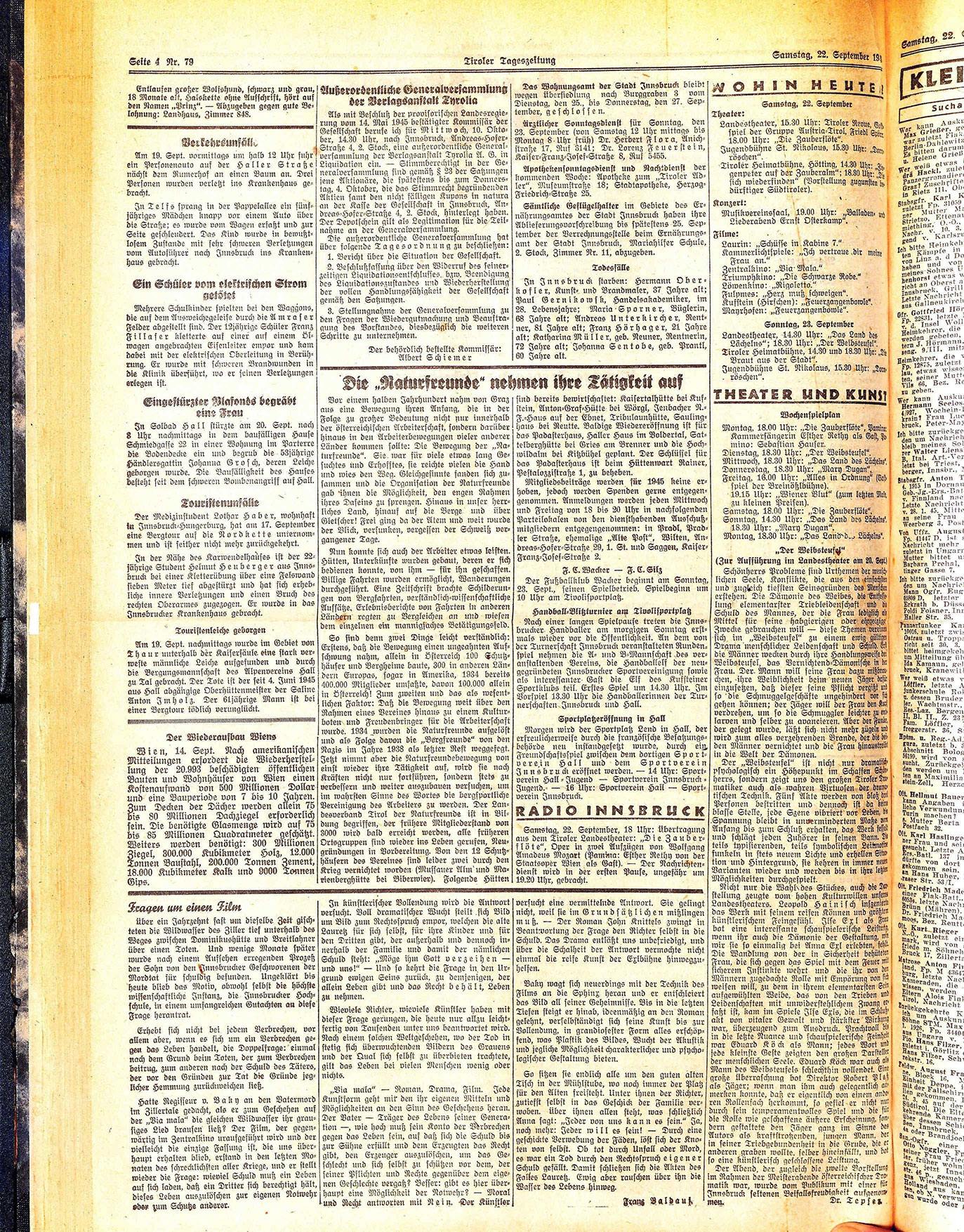sind bereits bewirtschaftet: Kaisertalhütte bei Kufstein, Anton=Graf=Hütte bei Wörgl, Jenbacher N.= F.=Haus auf der Ebnet, Tribulaunhütte, Saulinghaus bei Reutte. Baldige Wiedereröffnung ist für das Padasterhaus, Haller Haus im Voldertal, Sattelberghütte bei Gries am Brenner und die Hochwildalm bei Kitzbühel geplant. Der Schlüssel für das Padasterhaus ist beim Hüttenwart Rainer, Pestalozzistraße 1, zu beheben.