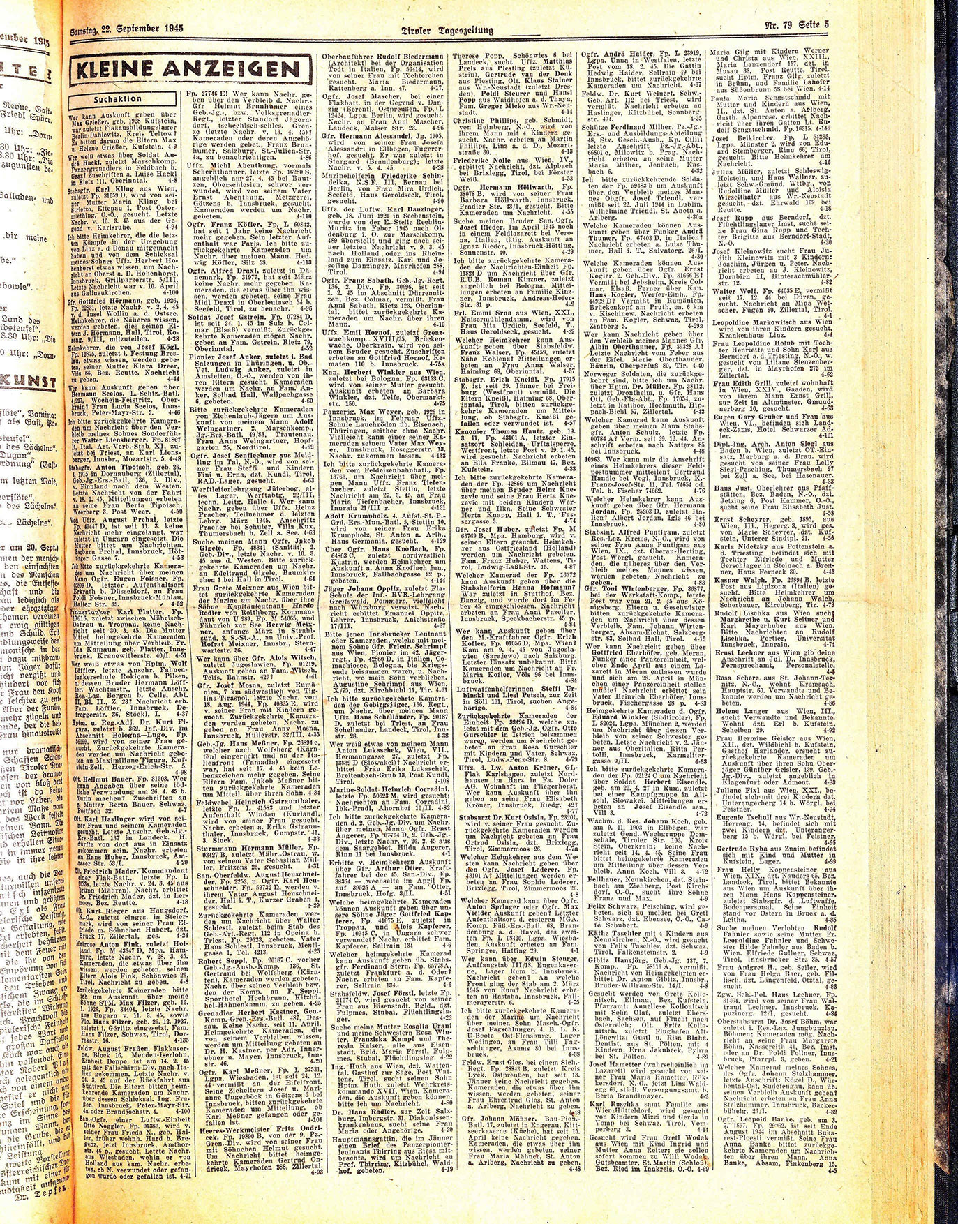 Bitte jenen Innsbrucker Leutnant oder Kameraden, welche mit meinem Sohne Gfr. Friedr. Schrimpf aus Wien, Pionier im 42. Jägerregt., Fp. 42860 D, in Italien, Comachiosee, Bologna, bis Kriegsende beisammen waren, u. Nachricht, wo mein Sohn verblieben. Augustine Schrimpf aus Wien, X/75, dzt. Kirchbichl 11, Tir. 4-61 Ich bitte zurückgekehrte Kameraden der Gebirgsjäger, 136. Regt., um Nachr. über meinen Mann Uffz. Hans Schellander, Fp. 20187 D, zuletzt bei Triest, an Frau Schellander, Landeck, Tirol, Innstr. 28. 4-38