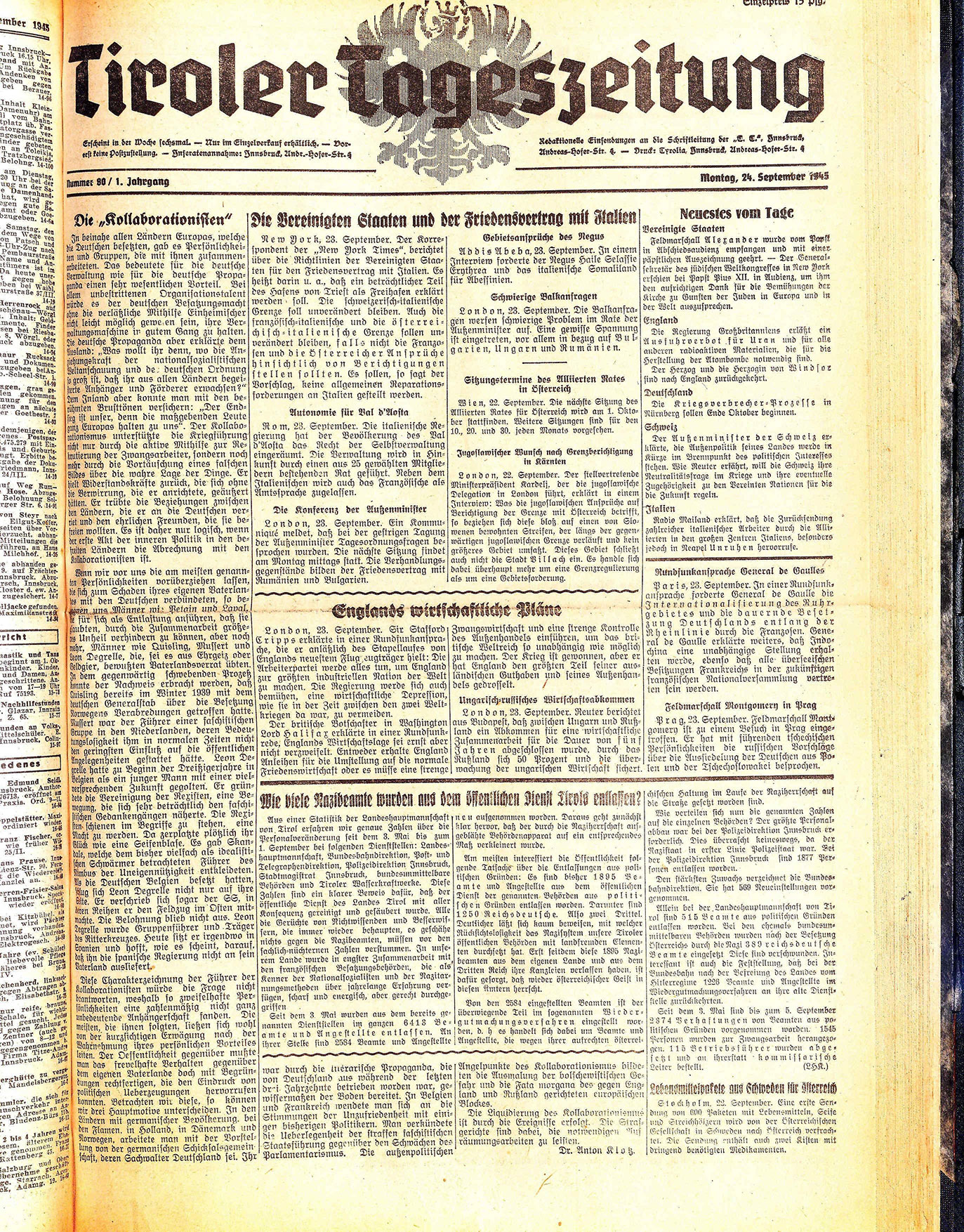 Erscheint in der Woche sechsmal. — Nur im Einzelverkauf erhältlich. — Vorerst keine Postzustellung. — Inseratenannahme: Innsbruck, Andr.-Hofer-Str. 4