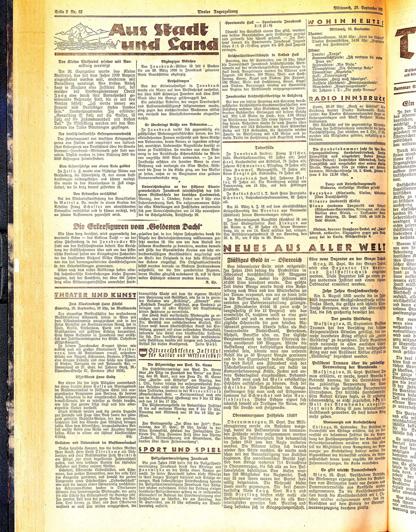 In Innsbruck starben: Franz Fischer, städt. Markthallenmeister, 63 Jahre alt; Josef Heel, Landarbeiter aus Südtirol, 75 Jahre alt; Johann Gschwentner, Pflegling, 70 Jahre alt; Alois Hummel, Malergehilfe, 78 Jahre alt; Anna Longin geb. Kadrnoska, 70 Jahre alt.