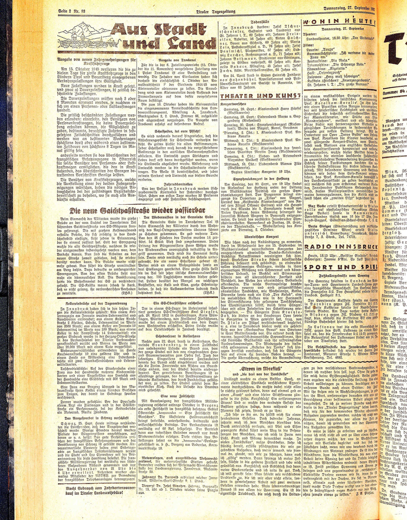 Schwaz, 25. Sept. Heute mittags verkündeten die Lautsprecher, daß das Ausgehverbot verschärft wurde Wenige Stunden darauf wurden Plakate des Bürgermeisters angeschlagen, auf denen es u. a. heißt: Das gute Verhältnis zwischen der französischen Besatzungstruppe und der Bevölkerung von Schwaz ist getrübt worden. Unverantwortliche Elemente haben zwei Sabotageakte an französischen Telephonleitungen verübt und die Stadt und ihre Einwohner mit der Verantwortung für diese Handlung belastet. Die französische Militärregierung hat vorläufig von schärferen Maßnahmen Abstand genommen und nur das Ausgehverbot von 21 Uhr bis 6 Uhr erweitert. Außerdem wurden ehemalige Mitalieder der NSDAP. zur Bewachung der französischen Telephonanlagen