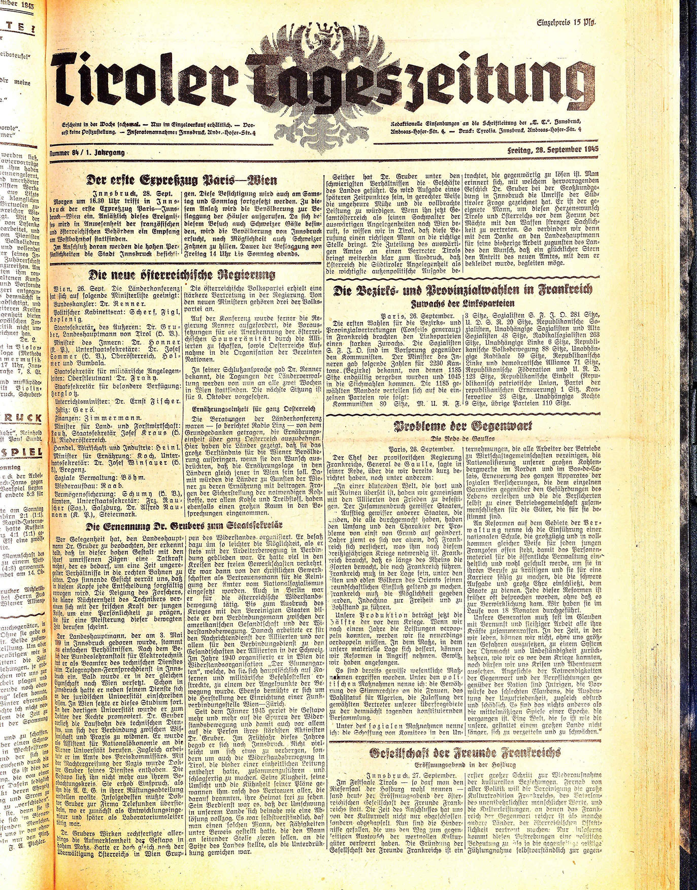 Im Festsaale Tirols — so darf man den Riesensaal der Hofburg wohl nennen — fand heute der Eröffnungsabend der österreichischen Gesellschaft der Freunde Frankreichs statt. Die Zeit des Anschlusses hat uns von der Kulturwelt nicht nur abgeschlossen sondern abgekapselt. Nun sind die Hindernisse gefallen, die uns den Weg zum gegenseitigen Austausch der wertvollen Kulturgüter versperrt haben. Die Gründung der Gesellschaft der Freunde Frankreichs ist ein