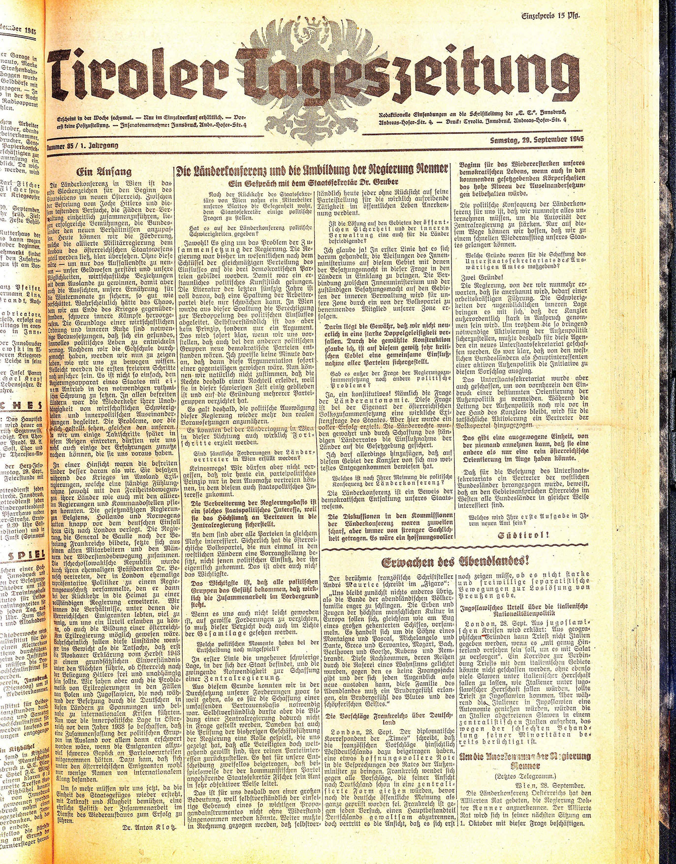 Erscheint in der Woche sechsmal. — Uur im Einzelverkauf erhältlich. — Dorerst keine Postzustellung. — Inseratenannahme: Innsbruck, Andr.-Hofer-Str. 4