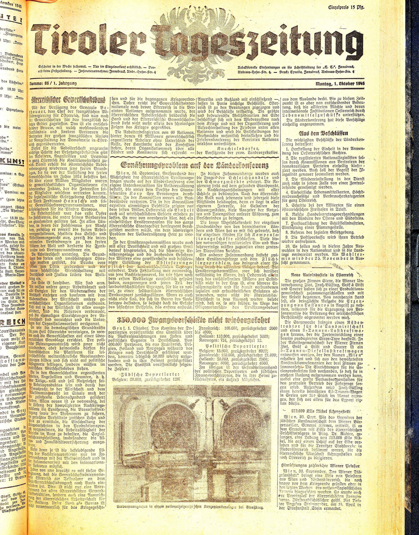 Erscheint in der Woche sechsmal. — Nur im Einzelverkauf erhältlich. — Dorerst keine Postzustellung. — Inseratenannahme: Innsbruck, Andr.=Hofer-Str.