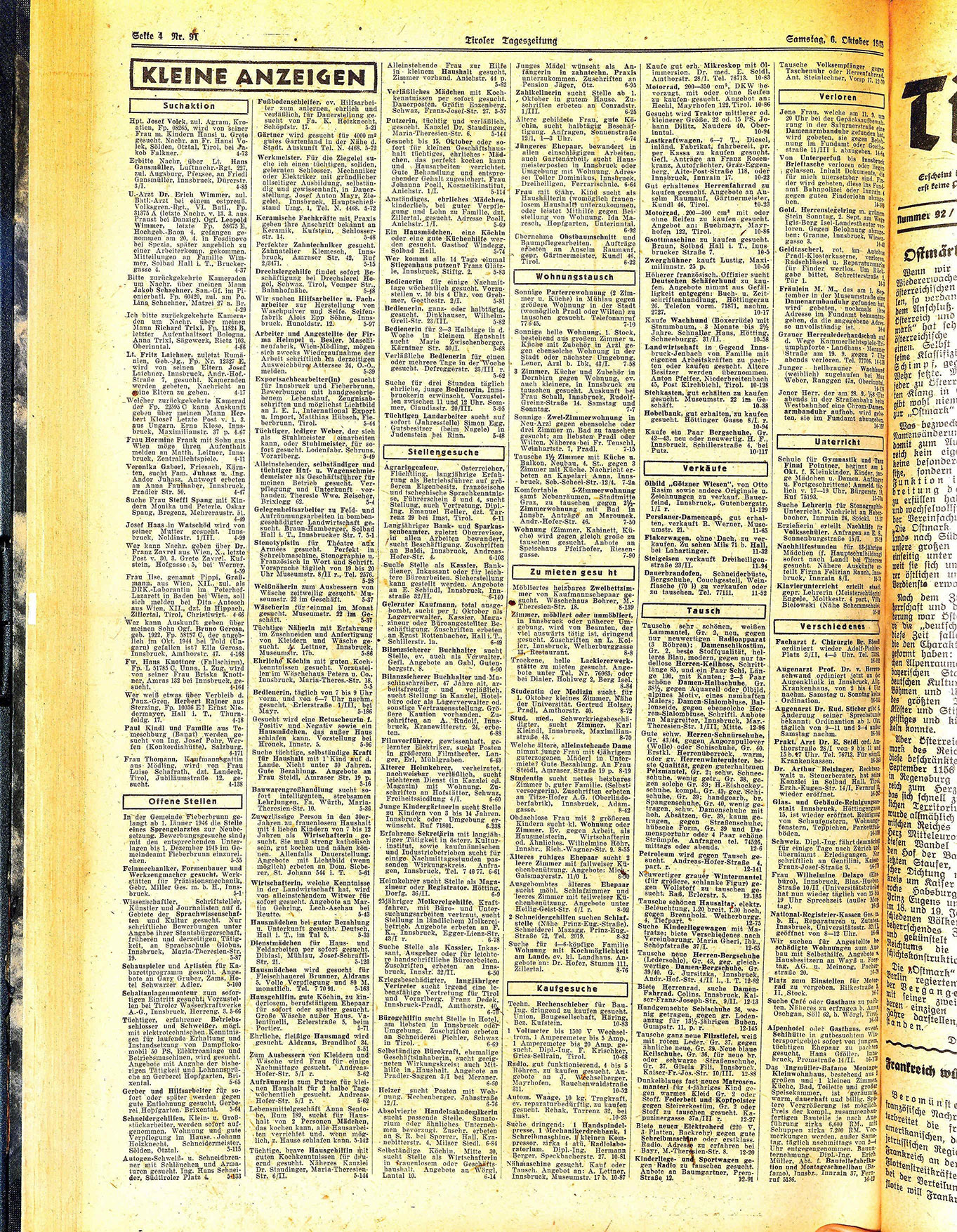 Josef Haas in Watschöd wird von seiner Mutter gesucht. Innsbruck, Noldinstr. I/III. 4-99 Wer kann Nachr. geben über Dr. Franz Zavrel aus Wien, X., letzte Post v. 30. 3. Grete Zavrel. Kufstein, Hofgasse 5, bei Werner.