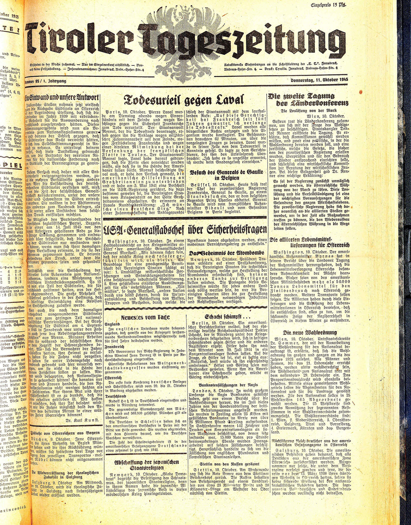 Erscheint in der Woche sechsmal. — Nur im Einzelverkauf erhältlich. — Vorerst keine Postzustellung. — Inseratenannahme: Innsbruck, Andr.-Hofer-Str. 4