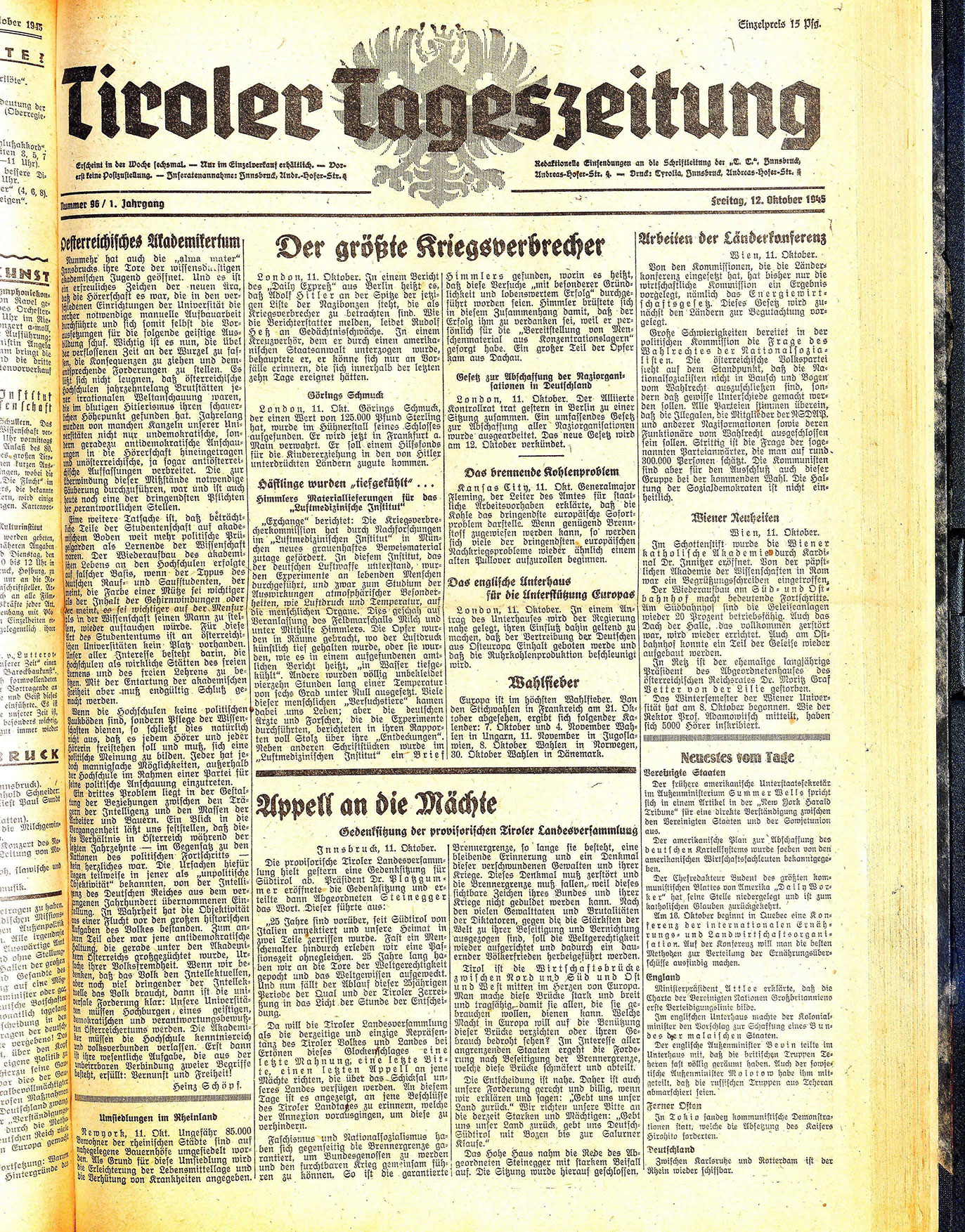 Erscheint in der Woche sechsmal. — Nur im Einzelverkauf erhältlich. — Vorerst keine Postzustellung. — Inseratenannahme: Innsbruck, Andr.-Hofer-Str. 4