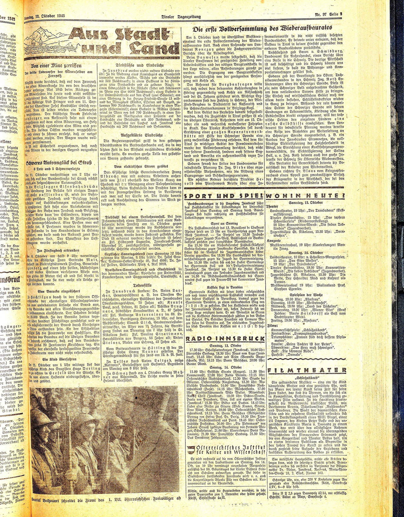 Am 5. Oktober fand im überfüllten Musikvereinssaal die erste Vollversammlung des Wiederaufbaurates statt. Nach einer Ansprache von Landesrat Ronczay gaben die Fachgruppenleiter Berichte über ihr Arbeitsgebiet.