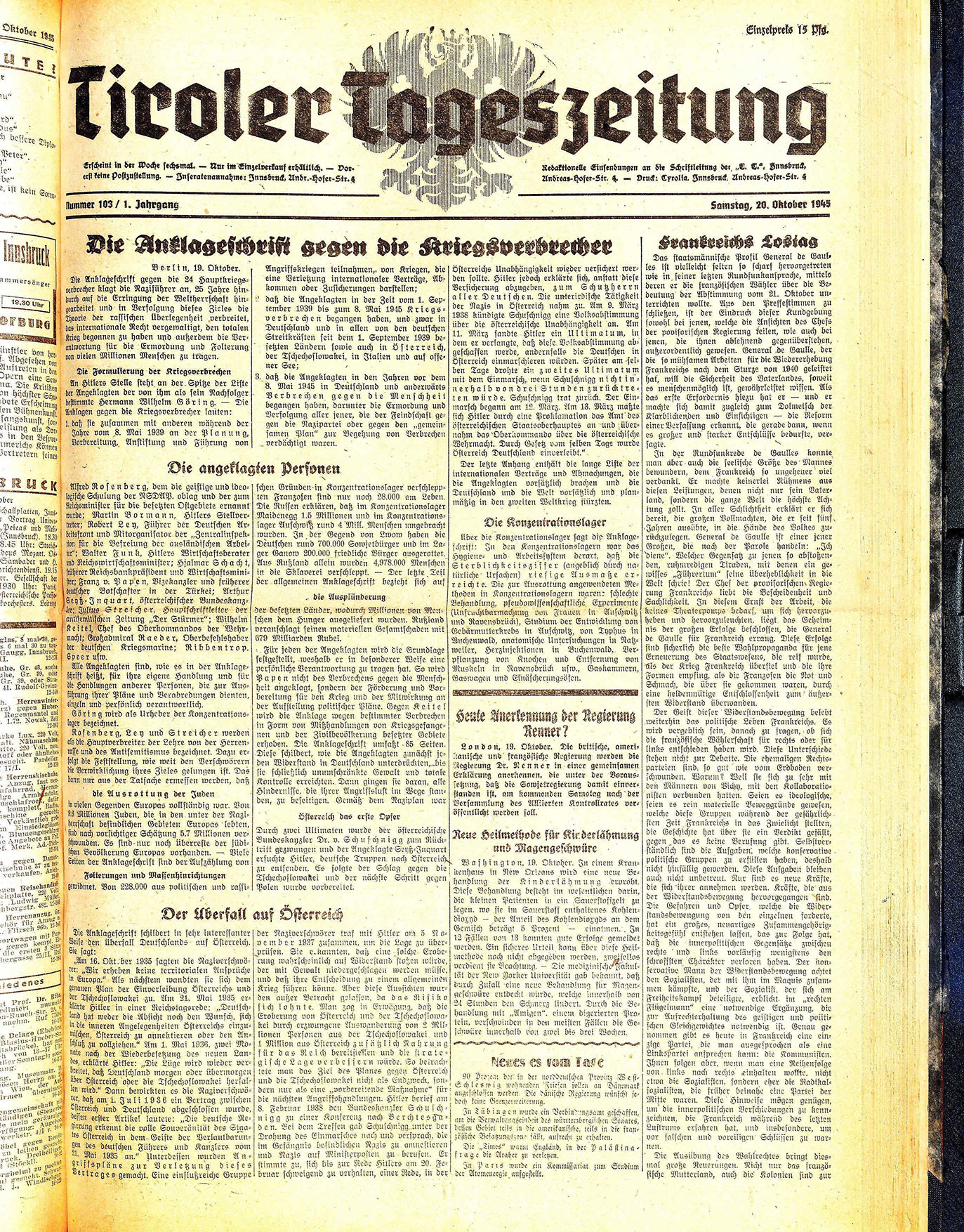 Die Anklageschrift gegen die 24 Hauptkriegsverbrecher klagt die Naziführer an, 25 Jahre hindurch auf die Erringung der Weltherrschaft hingearbeitet und in Verfolgung dieses Zieles die Theorie der rassischen überlegenheit „verbreitet, das internationale Recht vergewaltigt, den totalen Krieg begonnen zu haben und außerdem die Verantwortung für die Ermordung und Folterung von vielen Millionen Menschen zu tragen.