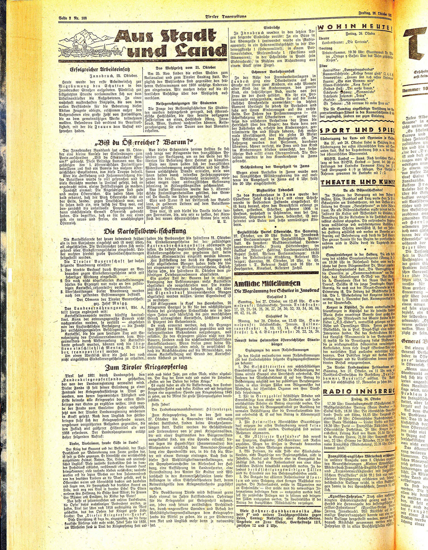 Krieg des Grauens und der Bestialität, den NaziDeutschland zur Welteroberung vom Zaune gerissen hat, ist spät zu Ende gegangen. Er hinterläßt eine wirtschaftlich ausgeblutete Heimat, Ruinen, Not, Tränen und unermeßliches Unglück! Viele tausende Landessöhne sind im fremden Frohndienst erblindet, verstümmekt oder dauernd krank heimgekommen; viele tausende bleiben verschollen; tausende wurden erst die letzten Wochen vor dem Zusammenbruch von den deutschen Treibern an die Wand gestellt, weil sie Österreicher waren und österreichisch dachten und handelten und liegen nun, die Zwangsjacke des deutschen Heeres am Leibe, weit weg von Tirol in fremder Erde! Die Eltern verloren ihre Hoffnung, die Stütze ihres Alters; die Frauen ihre Männer und Ernährer,