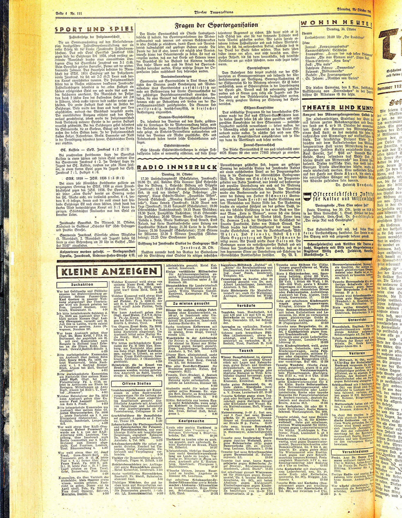Voraussetzungen geschaffen sind, begann am gestrigen Sonntag der wesentliche Einbau des Innsbrucker Radios mit einem entscheidenden Anteil an der Programmgestaltung in die Sendungen der österreichischen Sendegruppe West. Dr. Arthur von Schuschnigg, der Programmgestalter von Radio Innsbruck, war sowohl auf hochwertige und populäre Unterhaltung wie auch auf die Wahrung anspruchsvoller Kulturinteressen bedacht. Am Vormittag wurde eine Beethovenmesse aus der Pradler Pfarrkirche unter der Leitung von Herbert Gschwenter übertragen, worauf Traude Foresti mit starker Einfühlung aus dem Marienleben von Rainer Rilke las. Der Nachmittag brachte ein reizendes Hörspiel um das goldene Dachl, sowie eine fesselnde Einführung in das neue Buch von