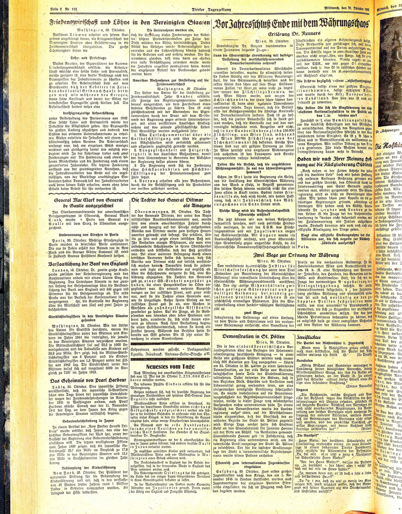 Schon im Mai hatte die Regierung ein Gesetz das die Loslösung der österreichischen Währung von der Mark v rsieht, in Angriff genommen Ein solches Gesetz könnte natürlich nicht für eine Zone allein in Kraft treten. Später traten Hindernisse ein, doch mich dünkt, wir haben Hoffnung, daß mit Jahresschluß das Wäh rungschaos ein Ende finden wird.