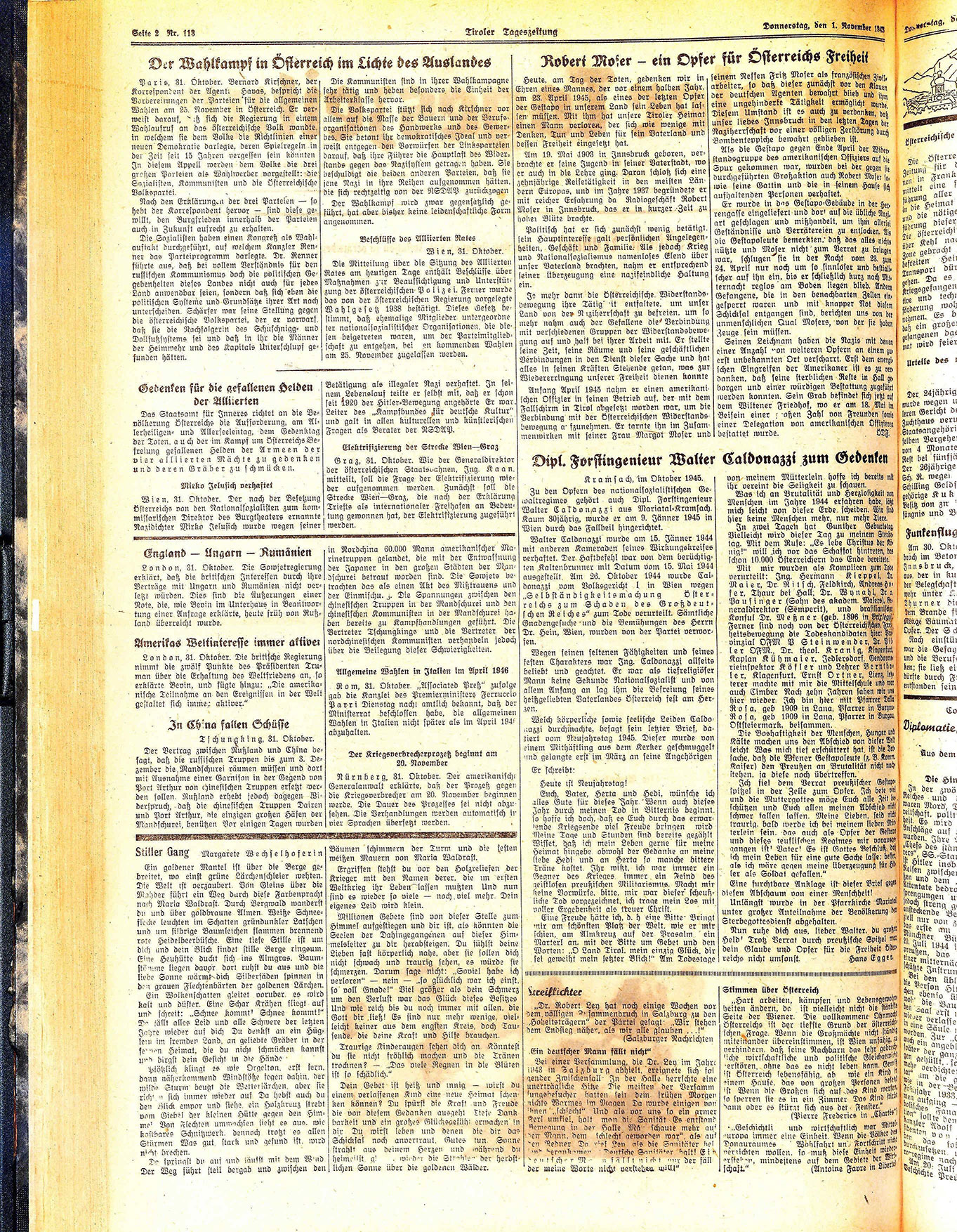 Das Staatsamt für Inneres richtet an die Bevölkerung Österreichs die Aufforderung, am Allerheiligen= und Allerseelentag, dem Gedenktag der Toten, auch der im Kampf um Österreichs Befreiung gefallenen Helden der Armeen der vier alliierten Mächte zu gedenken und deren Gräber zu schmücken.