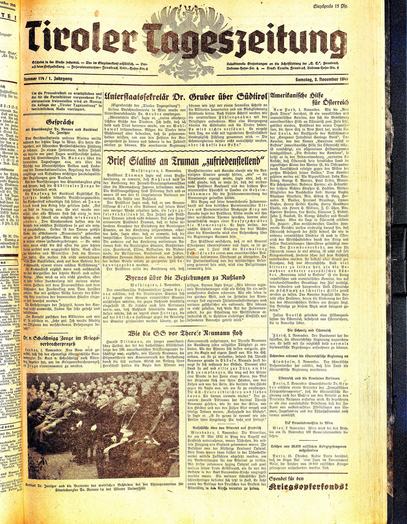 können wir jetzt mit einem formellen Schritt an die Alliierten herantreten und um Rückgliederung Südtirols bitten. Nach diesem Schritt werden wir die unmittelbare Fühlungnahme mit den Beteiligten aufnehmen. Aber eine überzeugung können die Südtiroler und die Tiroler haben: Es wird nichts versäumt. Es vergeht kein Tag, wo nicht mit irgendeiner Persönlichkeit diesbezüglich Fühlung genommen wird. — Die Schwierigkeiten dürfen nicht unterschätzt werden, aber ich hoffe das Beste.“