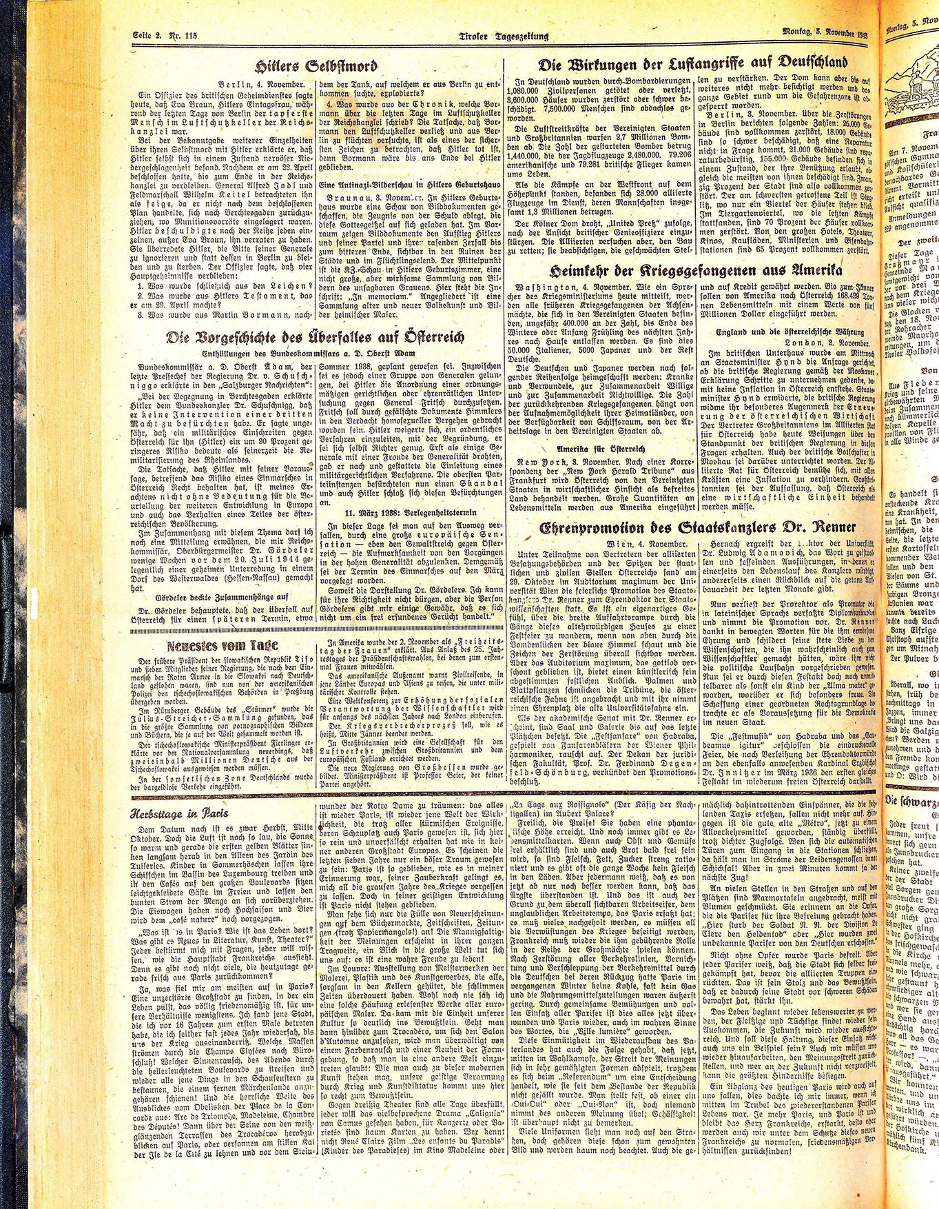 Braunau, 3. Novemder. In Hitlers Geburtshaus wurde eine Schau von Bilddokumenten geschaffen, die Zeugnis von der Schuld ablegt, die diese Gottesgeißel auf sich geladen hat. Im Vorraum zeigen Bilddokumente den Aufstieg Hitlers und seiner Partei und ihren rasenden Zerfall bis zum bitteren Ende, sichtbar in den Ruinen der Städte und im Flüchtlingselend. Der Mittelpunkt ist die KZ.=Schau in Hitlers Geburtszimmer, eine nicht große, aber wirksame Sammlung von Bildern des unsagbaren Grauens. Hier steht die Inschrift: „In memoriam.“ Angegliedert ist eine Sammlung alter und neuer Volkskunst und Bilder heimischer Maler.