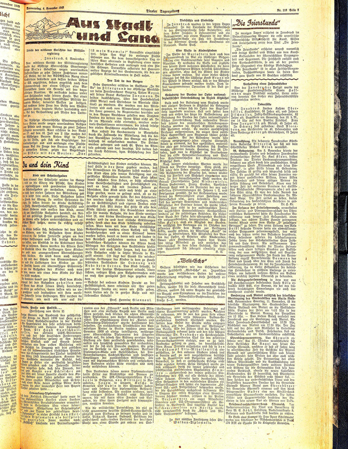 Im Walde bei Mariastein fand nach dem Zusammenbruch im Mai ein 15jähriger Metzgerlehrling eine Maschinenpistole samt Magazin und Munition. Er versteckte die Waffe und erzählte von seinem Fund mehreren Schulbuben, die dann öfter an abgelegenen Plätzen heimlich Schießübungen abhielten, ohne daß die Eltern der Kinder etwas davon wußten. Bei einer dieser Schießübungen hat sich der 12jährige Horst Brand mit der Pistole so schwer verletzt, daß er ins Wörgler Krankenhaus gebracht werden mußte. Trotz sofort worgenommener Operation ist der Bub gestorben