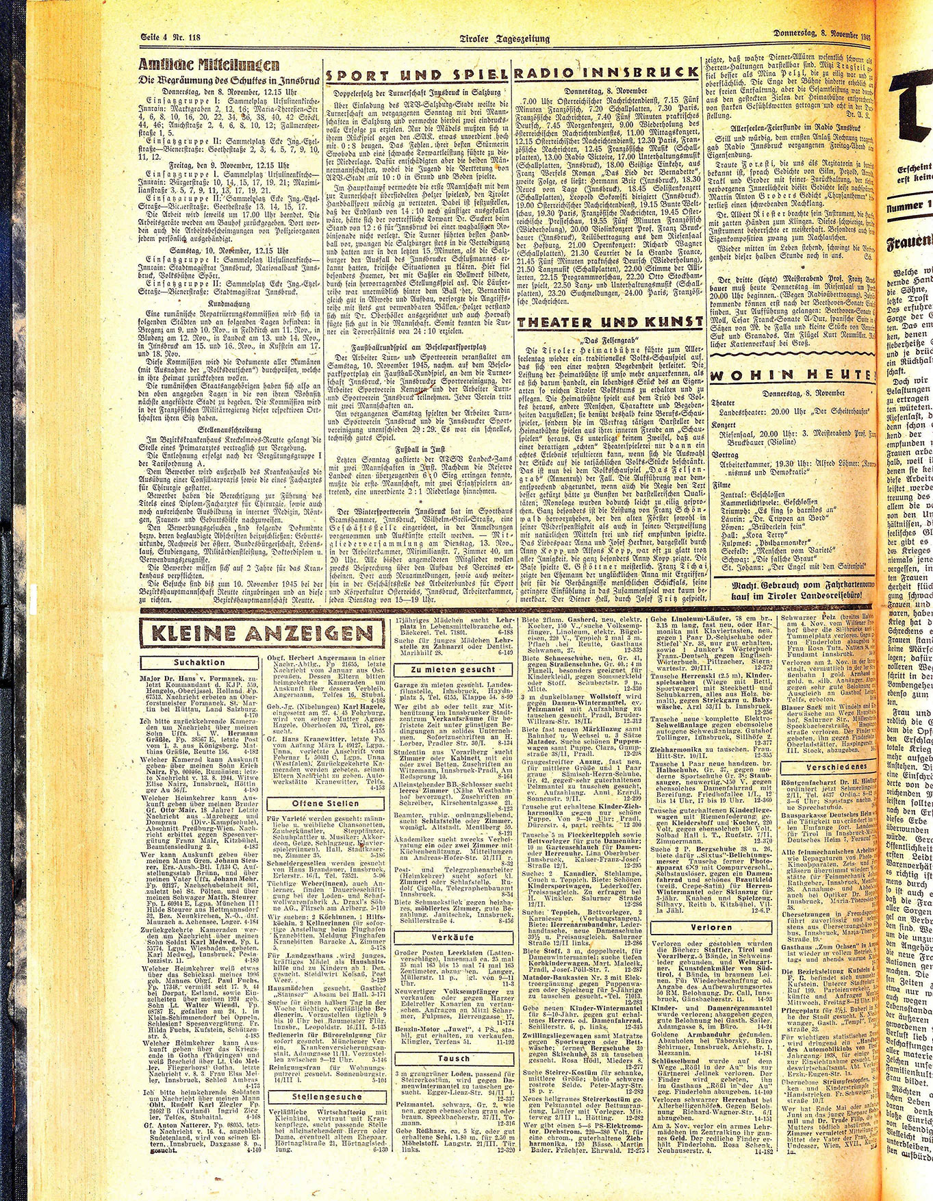 Die Tiroler Heimatbühne führte zum Allerseelentag wieder ein traditionelles Volks=Schauspiel auf. das sich von einer wahren Begebenheit herleitet. Die Leistung der Heimatbühne ist umso mehr anzuerkennen, als es sich darum handelt, ein lebendiges Stück des an Eigenarten so reichen Tiroler Volkstums zu erhalten und zu pflegen. Die Heimatbühne spielt aus dem Trieb des Volkes heraus, andere Menschen, Charaktere und Begebenheiten darzustellen; sie benützt deshalb keine Berufs=Schauspieler, sondern die im Werktag tätigen Darsteller der Heimatbühne spielen aus ihrer inneren Freude am „Schauspielen“ heraus. Es unterliegt keinem Zweifel, daß aus einer derartigen „echten“ Theaterspielerei nur dann ein echtes Erlebnis resultieren kann, wenn sich die Auswahl der