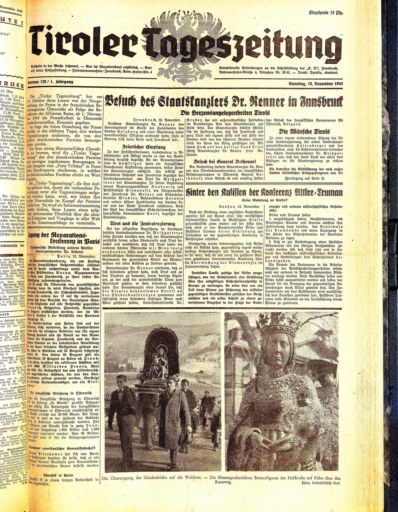 Gruber, der mit außerordentlicher Initiative im Auswärtigen Amt dem Staatskanzler zur Seite stehe. Der Staatskanzler drückte schließlich die Hoffnung aus, daß sich Innsbruck und ganz Tirol mit eigener Hilfe und mit Hilfe des Staates bald von den schweren Wunden erholen wird, die ihnen der Krieg geschlagen hat. Mit einem Hoch auf das heilige Land Tirol schloß Staatskanzler Dr. Renner seine Ansprache.