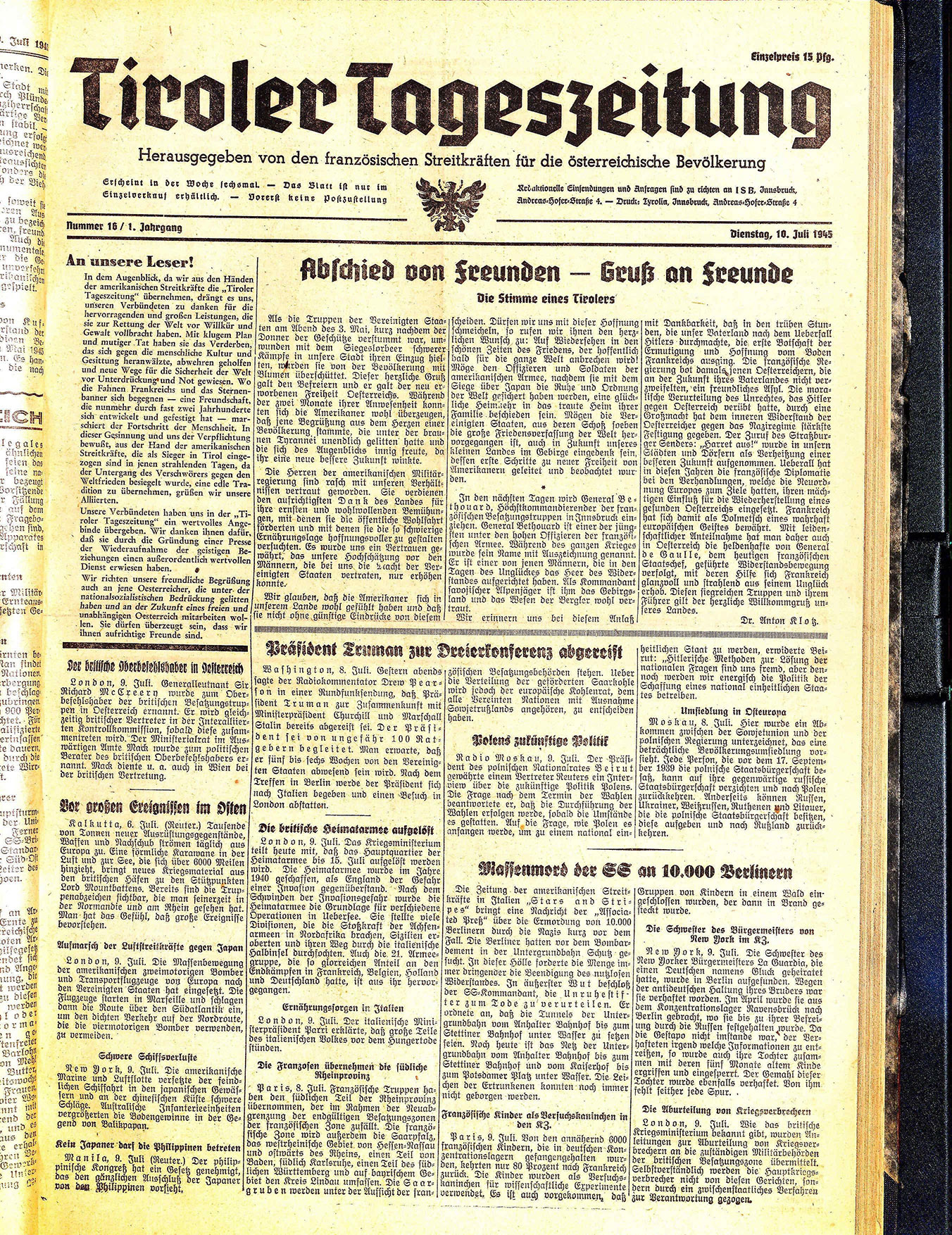 In dem Augenblick, da wir aus den Händen der amerikanischen Streitkräfte die „Tiroler Tageszeitung“ übernehmen, drängt es uns, unseren Verbündeten zu danken für die hervorragenden und großen Leistungen, die sie zur Rettung der Welt vor Willkür und Gewalt vollbracht haben. Mit klugem Plan und mutiger Tat haben sie das Verderben, das sich gegen die menschliche Kultur und Gesittung heranwälzte, abwehren geholfen und neue Wege für die Sicherheit der Welt vor Unterdrückung und Not gewiesen. Wo die Fahnen Frankreichs und das Sternenbanner sich begegnen — eine Freundschaft, die nunmehr durch fast zwei Jahrhunderte sich entwickelt und gefestigt hat — marschiert der Fortschritt der Menschheit. In dieser Gesinnung und uns der Verpflichtung bewußt, aus der Hand der amerikanischen Streitkräfte, die als Sieger in