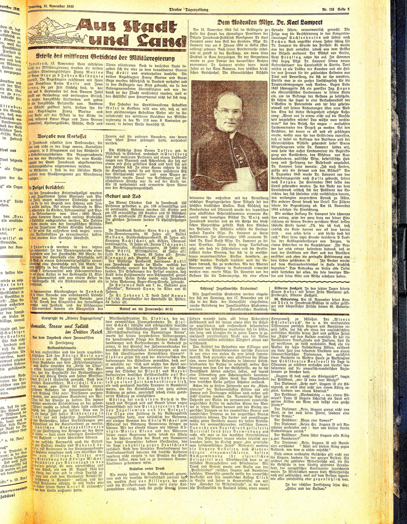 auch die Gestapo darnach, ihn zu verderben. Als der Pfarrer Neururer von Götzens in Buchenwald ermordet worden war. wurde Msgr. Dr. Lampert von der Gestapo für die Todesanzeige, die eine offene