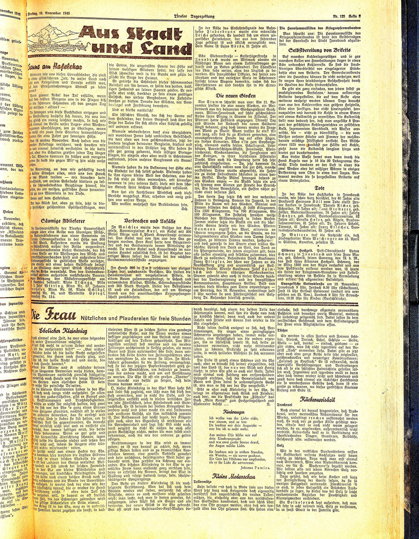 In der Nähe des Hußlhofes in Innsbruck wurde, wie schon kurz berichtet, der 65 Jahre alte Pensionist Hermann Köll vom Tode ereilt. Ferner starben in Innsbruck: Therese Ricker, geb. Schneider, 76 Jahre alt; Inna Greiderer, geb. Höller, Malermeisterswitwe, 78 Jahre alt; Josefg Schatzer, geb. Steidl, Bundesbahnerswitwe, 82 Jahre alt; Ernesta Hofer, geb. Nägele, Bundesbahnerswitwe, 81 Jahre alt; Dr. Johann Schodl, Tierarzt, 41 Jahre alt; Franz Erlacher, Bundesbahnoberbauarbeiter, 65 Jahre alt.