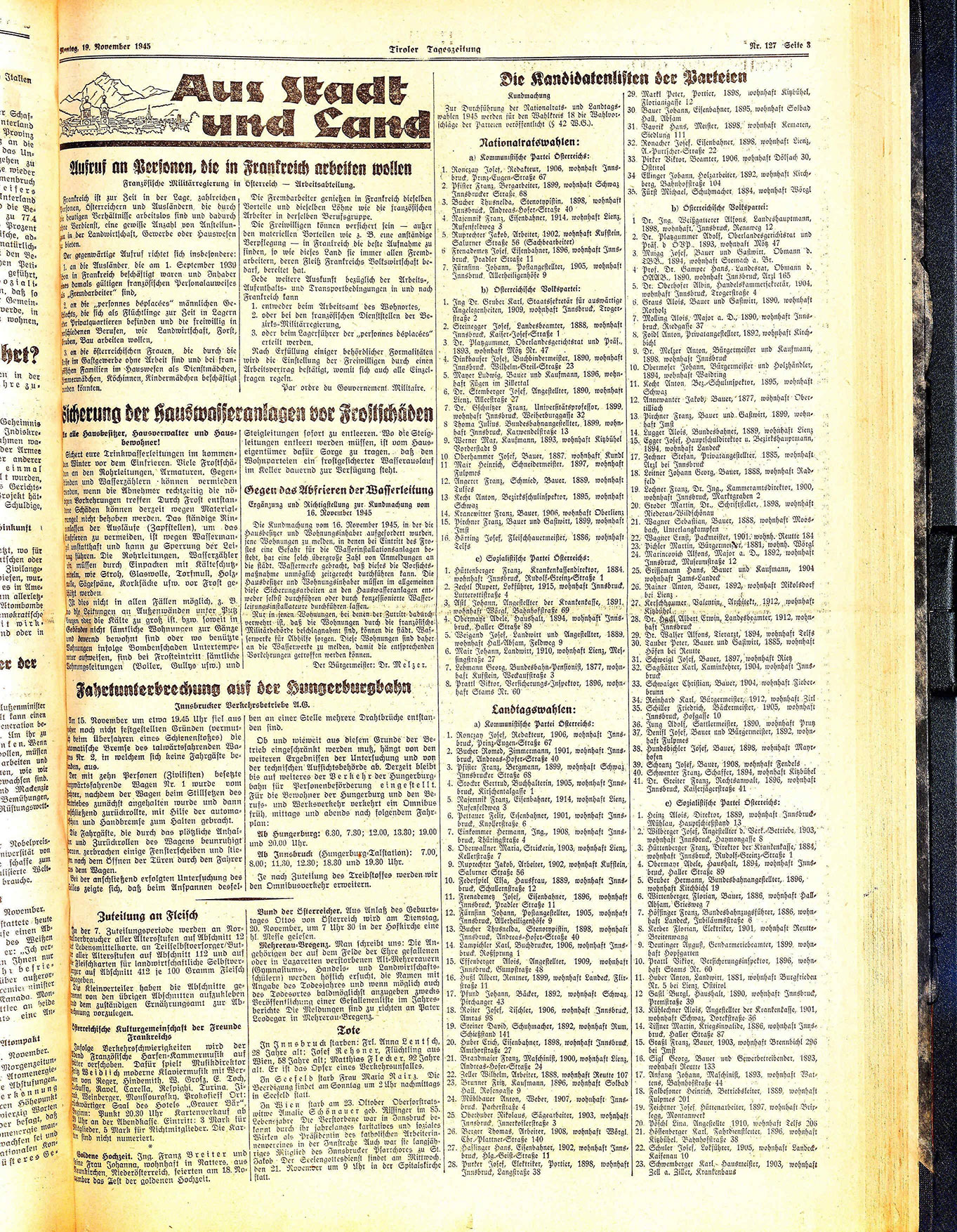 In Innsbruck starben: Frl. Anna Lentsch, 28 Jayre alt; Josef Rehsner, Flüchtling aus Wien, 58 Jahre alt; Matthias Flecker, 92 Jahre alt. Er ist das Opfer eines Verkehrsunfalles.