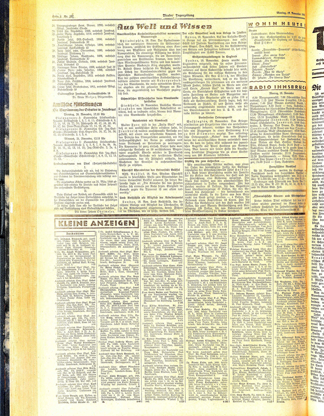 Auskunft erbeten über Otto Kern, Ceb. 1917. Fp. 23928 F, vermißt seit Okt. 44 bei Belgrad, und Josef Kern, geb. 1912. seit Ostern 45 Ersatztruppe Goslar, seither keine Nachricht. Julie Androschin. N.-Rum 232. Ruf 3627. 4-43 Amskunft erbeten über Obgf. Karl Scheiber. Fp. 12578, letzte Nachrieht vom April ans Triest. Frau Anna Scheiber, Umhausen 144,