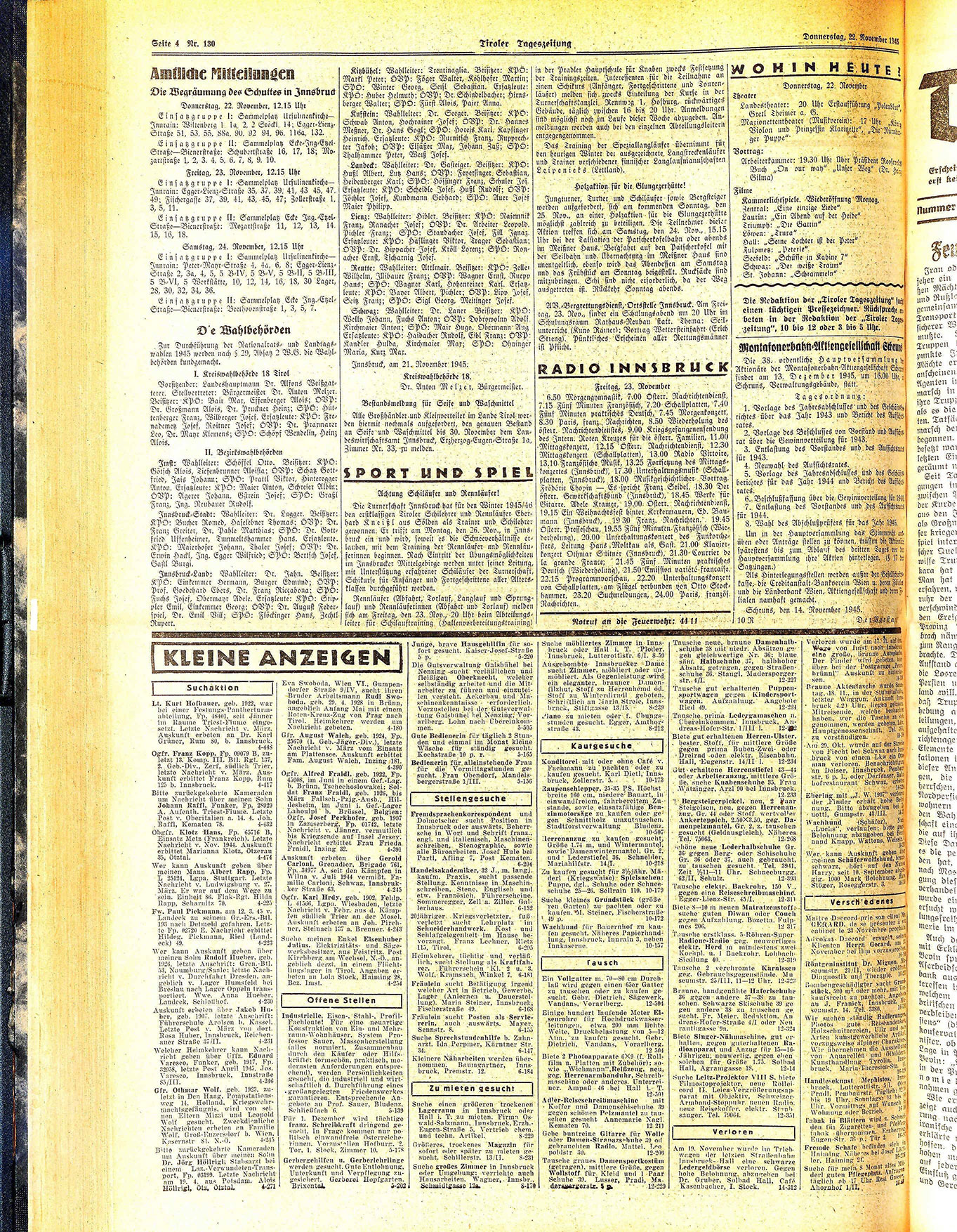 Die Turnerschaft Innsbruck hat für den Winter 1945/46 den ersiklassigen Tiroler Schilehrer und Rennläufer Eberhard Kneißl aus Sölden als Trainer und Schilehrer gewonnen. Er trifft am Montag, den 26. Nov., in Innsbruck ein und wird, soweit es die Schneeverhältnisse erlauben, mit dem Training der Rennläufer und Rennläuferinnen beginnen. Nach Eintritt der Übungsmöglichkeiten im Innsbrucker Mittelgebirge werden unter seiner Leitung, mit Unterstützung erfahrener Schiläufer der Turnerschaft, Schikurse für Anfänger und Fortgeschrittene aller Altersklassen durchgeführt werden.