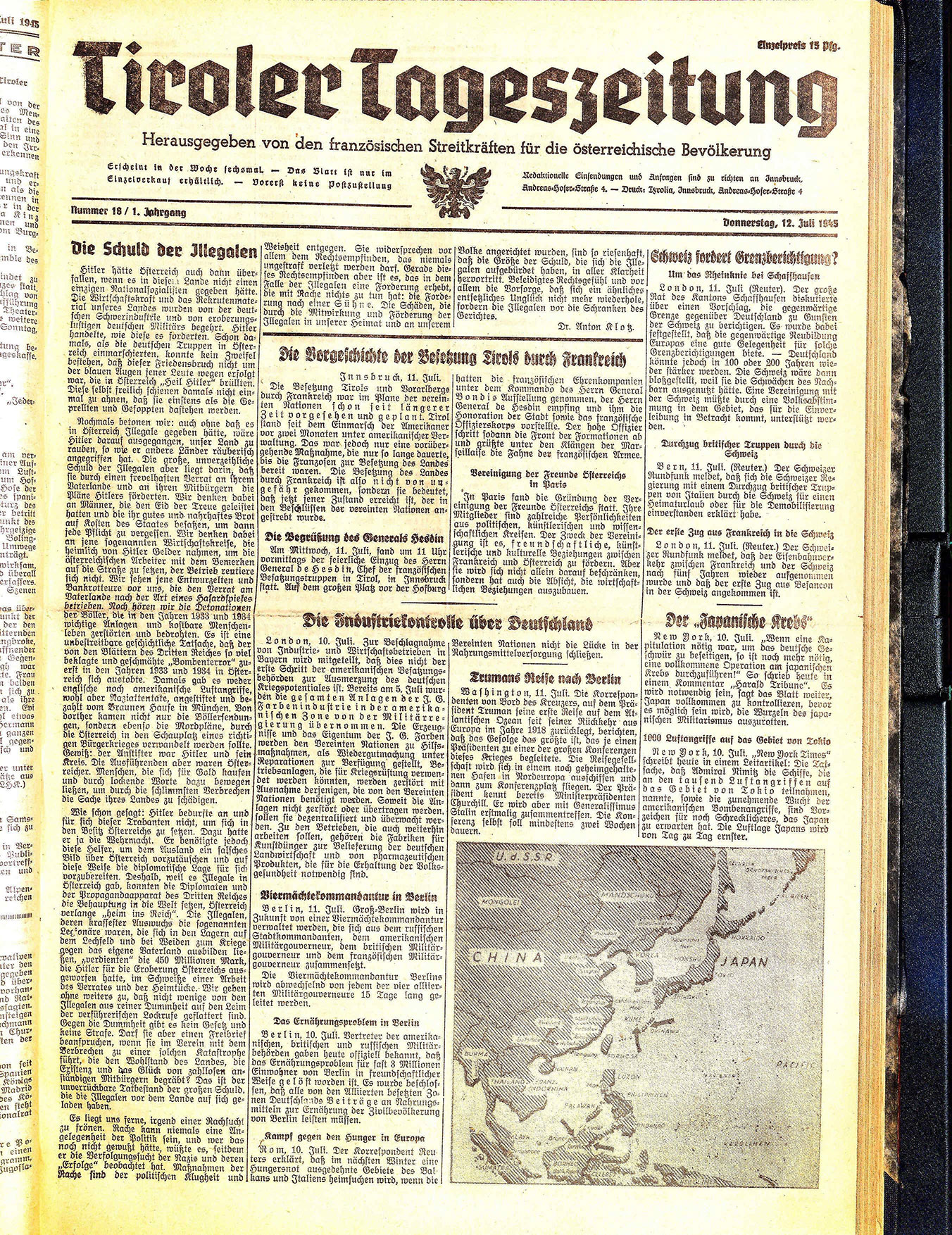 Die Besetzung Tirols und Vorarlbergs durch Frankreich war im Plane der vereinten Nationen schon seit längerer [Zeit vorgesehen und geplant. Tirol stand seit dem Einmarsch der Amerikaner vor zwei Monaten unter amerikanischer Verwaltung. Das war jedoch nur eine vorübergehende Maßnahme, die nur so lange dauerte, bis die Franzosen zur Besetzung des Landes bereit waren. Die Besetzung des Landes durch Frankreich ist also nicht von ungefähr gekommen, sondern sie bedeutet, daß jetzt jener Zustand erreicht ist, der in den Beschlüssen der vereinten Nationen angestrebt wurde.