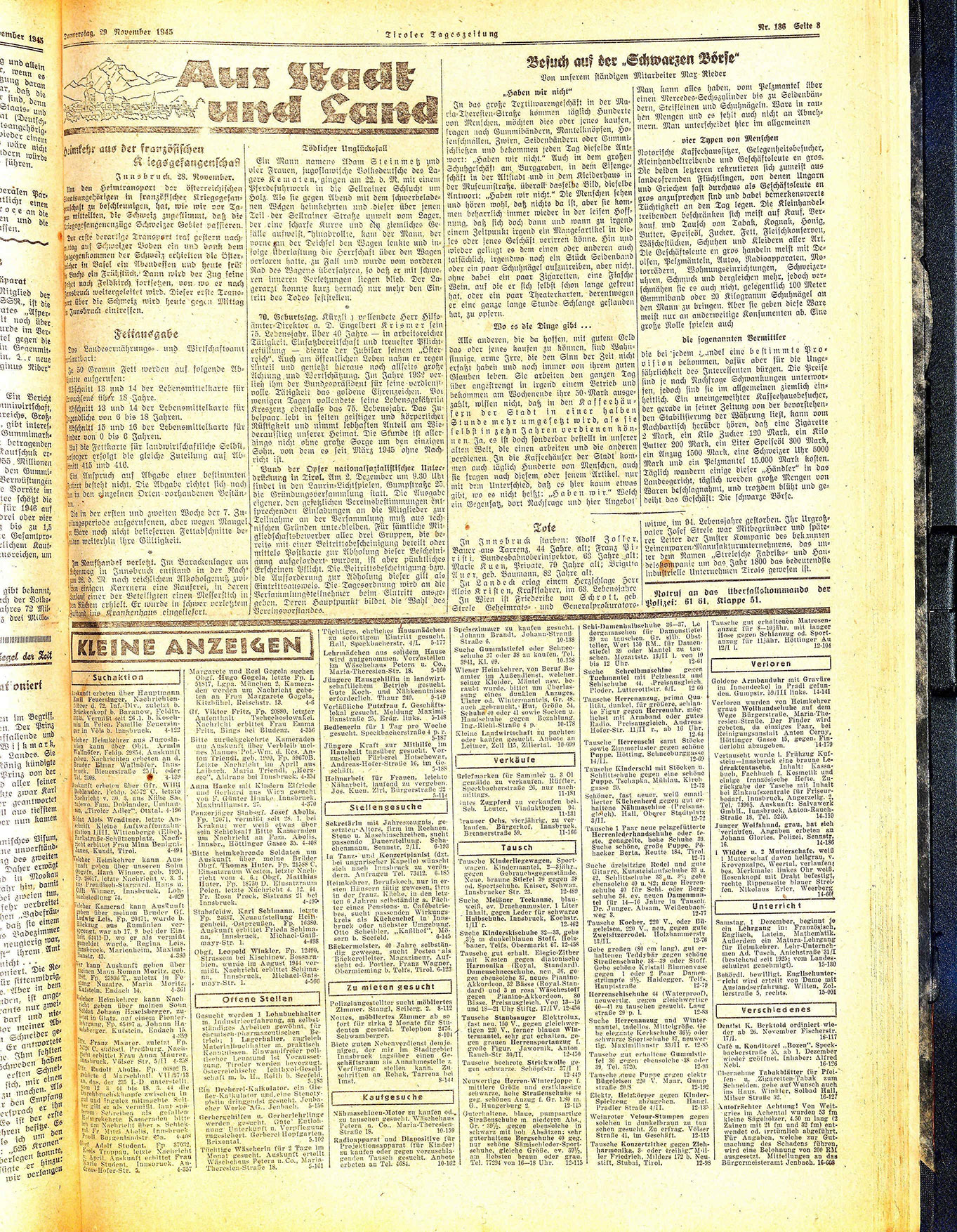 Iuskunft erbeten über Hauptmann Emil Feuersinger, Nachrichtenfährer d. 72. Inf.-Div., zuleizt b. Brückenkopf b. Baranow, Feldtr. 3135, Vermißt seit 26.1. b. Keschmin in Poien. Familie Feuersinger in Völs b. Innsbruck. 4-122 seicher Heimkehrer aus Jugeslavien kann über Oblt. Armin Vallnöfer, Feidp. 29854, Auskunft zeben. Nachrichten erbeten an d. Bruder Elmar Wallnöfer. InnsTbruck, Bienerstraße 25/1, oder Tel. 2108.* 4-139