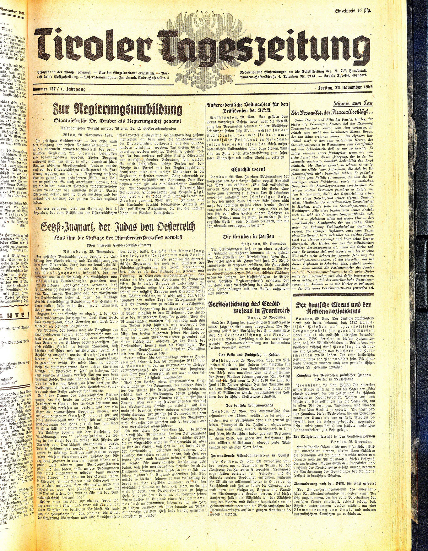 Erscheint in der Woche sechsmal. — Nur im Einzelverkauf erhältlich. — Vorerst keine Postzustellung. — Inseratenannahme: Innsbruck, Andr.=Hofer=Str. 4