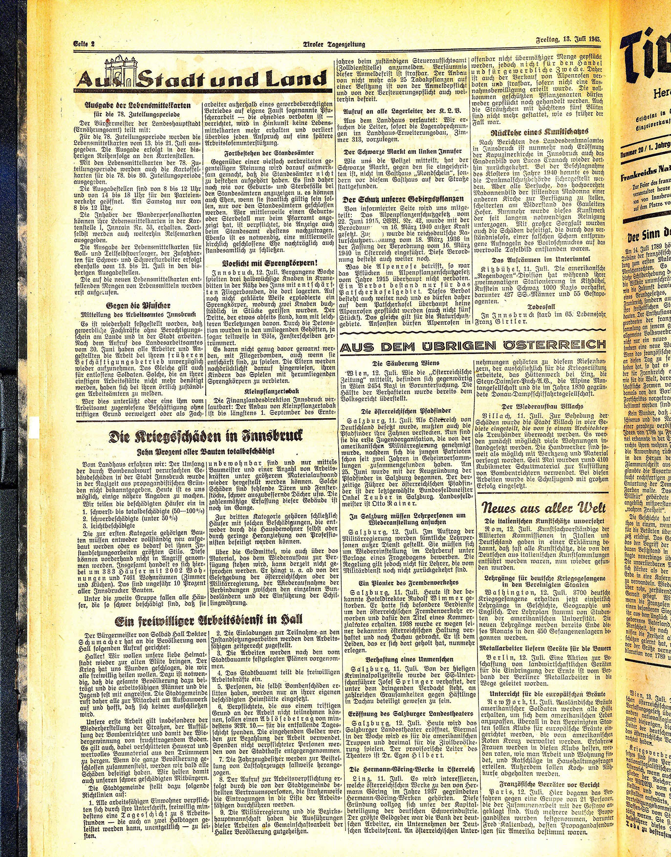 Vom Landhaus erfahren wir: Der Umfang der durch Bombenabwurf verursachten Gebäudeschäden in der Stadt Innsbruck wurde in der Nazizeit aus propagandistischen Gründen nicht bekanntgegeben. Heute ist es uns möglich, einige nähere Angaben zu machen.