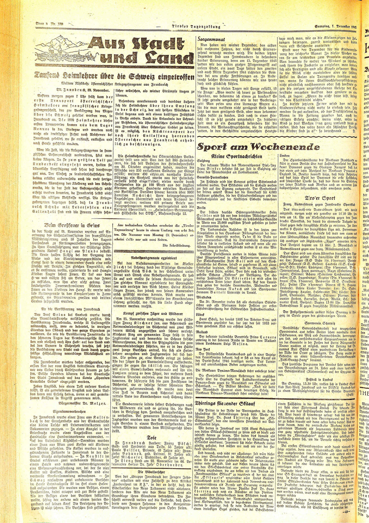 Gestern mergen gegen 7 Uhr früh kam der erste Transport, österreichischer Heimbehrer aus französischer Kriegsgefangenschaft, der zur Verkürzung des Weges öder die Schmeiz geleitet worden war, in Innsbruck an. Die 1030 Heimkehrer dieses erstea Trausportes kamen aus dem Lager Kennes in dei Bretagne und wurden nach nch als dreitägiger Fahrt nach Reichenau bei Inmshuc gesrilnt, wo sie enklaust, entlassen und nach Hause grschicht werden.