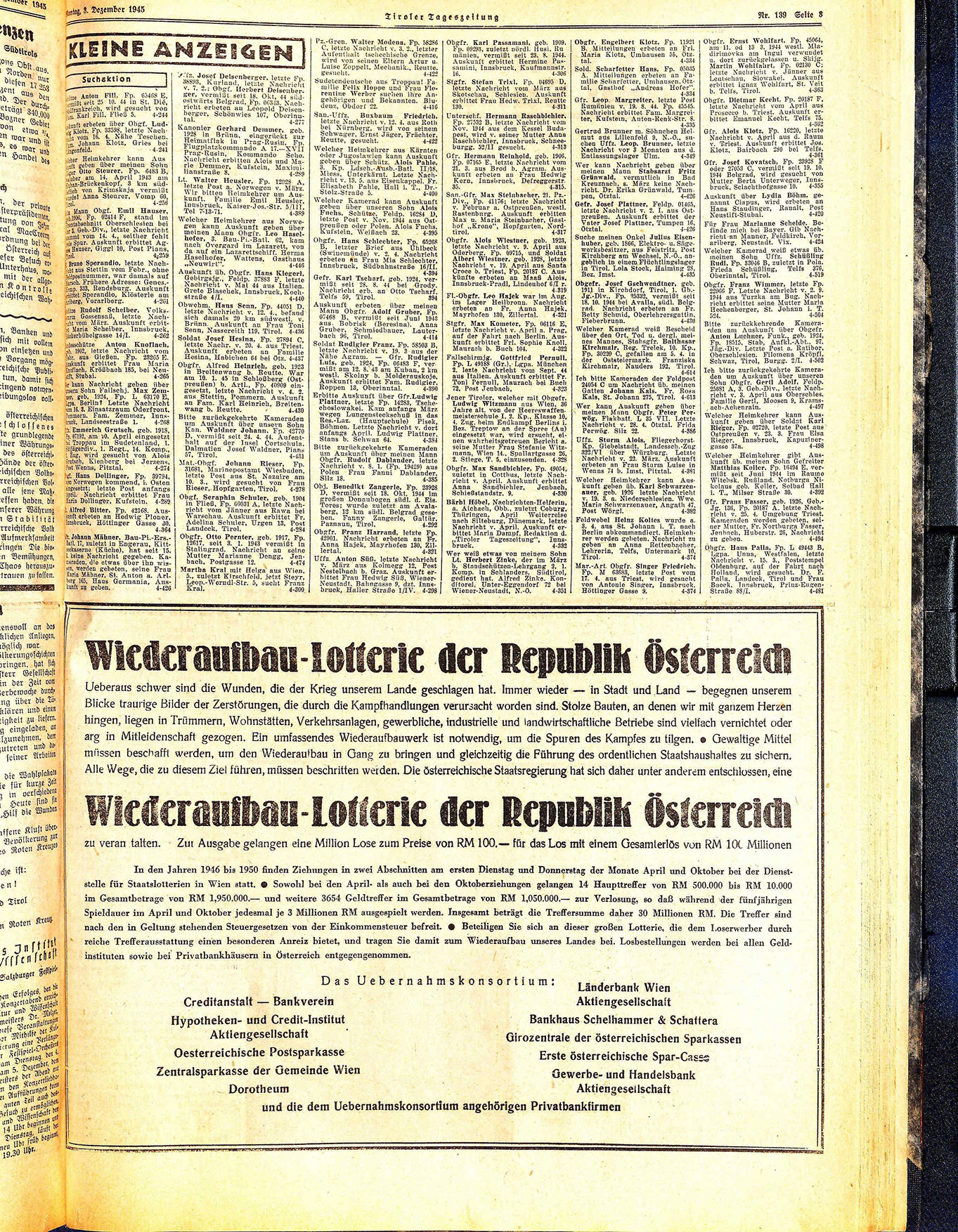 Gertrud Brunner m. Söhnchen Helmut aus Lillenfold 9, N.0, suchen Uffz. Leop. Brunner, letzte Nachricht vor 3 Monaten aus d. Entlassungslager Uim. 4.349 Wer kann Nachricht geben über meinen Mann Stabsarzt Fritz Grünwald, vermutlich in Bad Kreuznach, s. März keine Nachricht. Dr. Erika Grünwald, Tum. pen, Otztal. 4-420