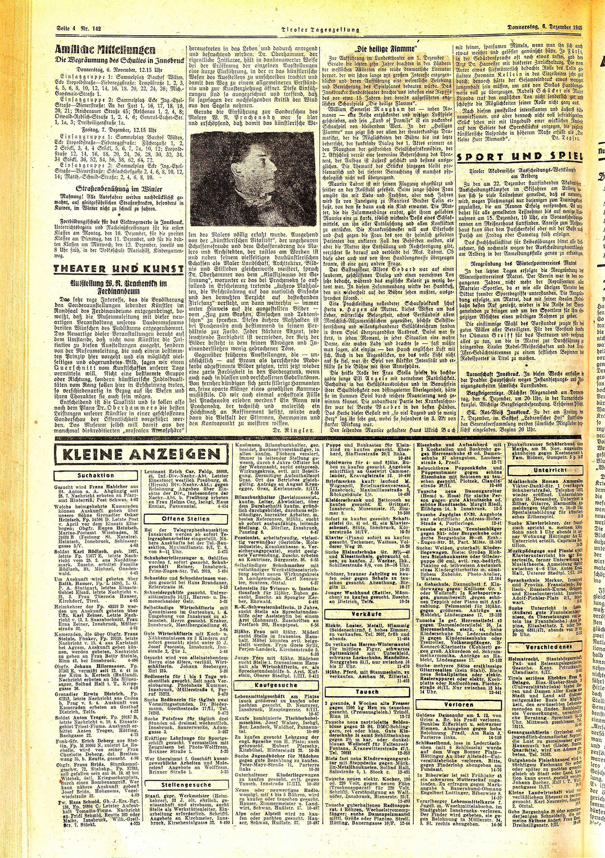 Guterhaltener Kinderliegewagen zu kaufen gesucht, evtl. gegen Tausch. Innstraße 17/III. 10-480 Neues oder neuwertiges Radio, womögl. mit 4 bis 5 Röhren, wird zu kaufen oder tauschen gesucht. Hauser, Zimmermeister u. Landwirt, Schwaz, Hußlstr. 37. 10-487 Alpe oder Alpteil wird zu kaufen oder pachten gesucht. Hauser, Schwaz, Hußlstr. 37. 10-487