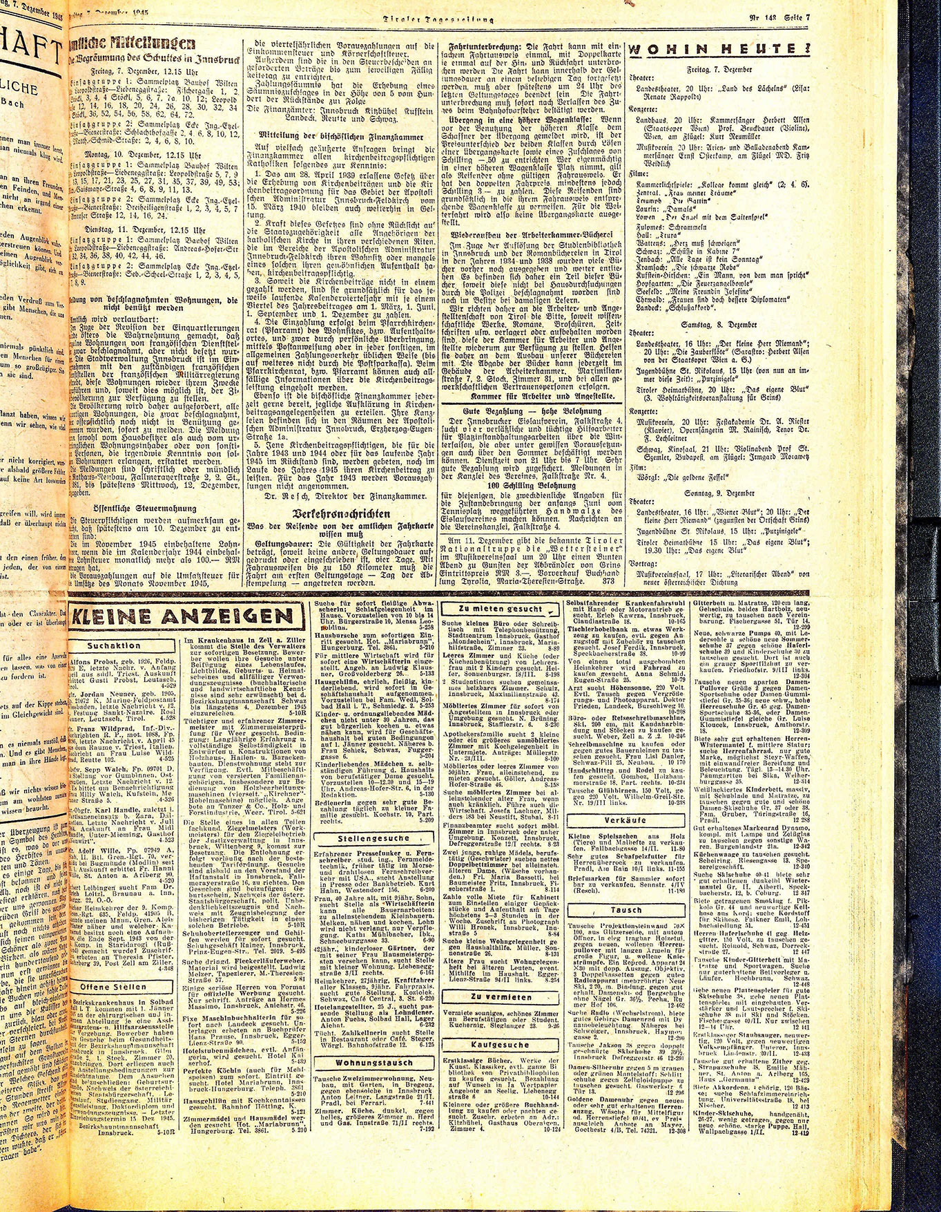 Landestheater, 16 Uhr: „Wiener Blut“; 20 Uhr: „Der kleine Herr Niemand“ (zugunsten der Ortschaft Grins) Jugendbühne St. Rikolaus. 15 Uhr: „Purzinigele“ Tiroler Heimatbühne 15 Uhr: „Das eigene Blut“; 19.30 Uhr: „Das eigene Blut“