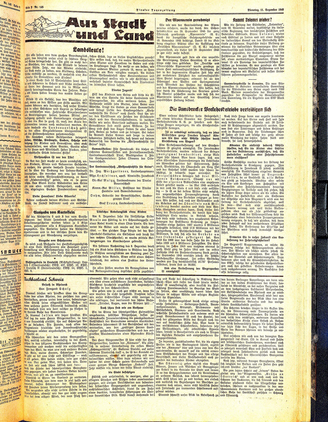 liches Stück, lege es diesen Unglücklichen zurecht! Wir wissen doch, daß die wahre Weihnachtsfreude jeder Mutter und Hausfrau im Geben und nicht im Empfangen liegt. Du weißt es am besten, wie einer anderen Mutter zumute ist, wenn es ihren Liebsten am Not##ndigsten mangelt. An diesem ersten Weihnachtsfest ohne Kanonendonner und Sirenengeheul wollen wir in echt christlicher und wahrhaft sozialer Gemeinschaft kein Tirolerkind im bittersten Elend lassen.
