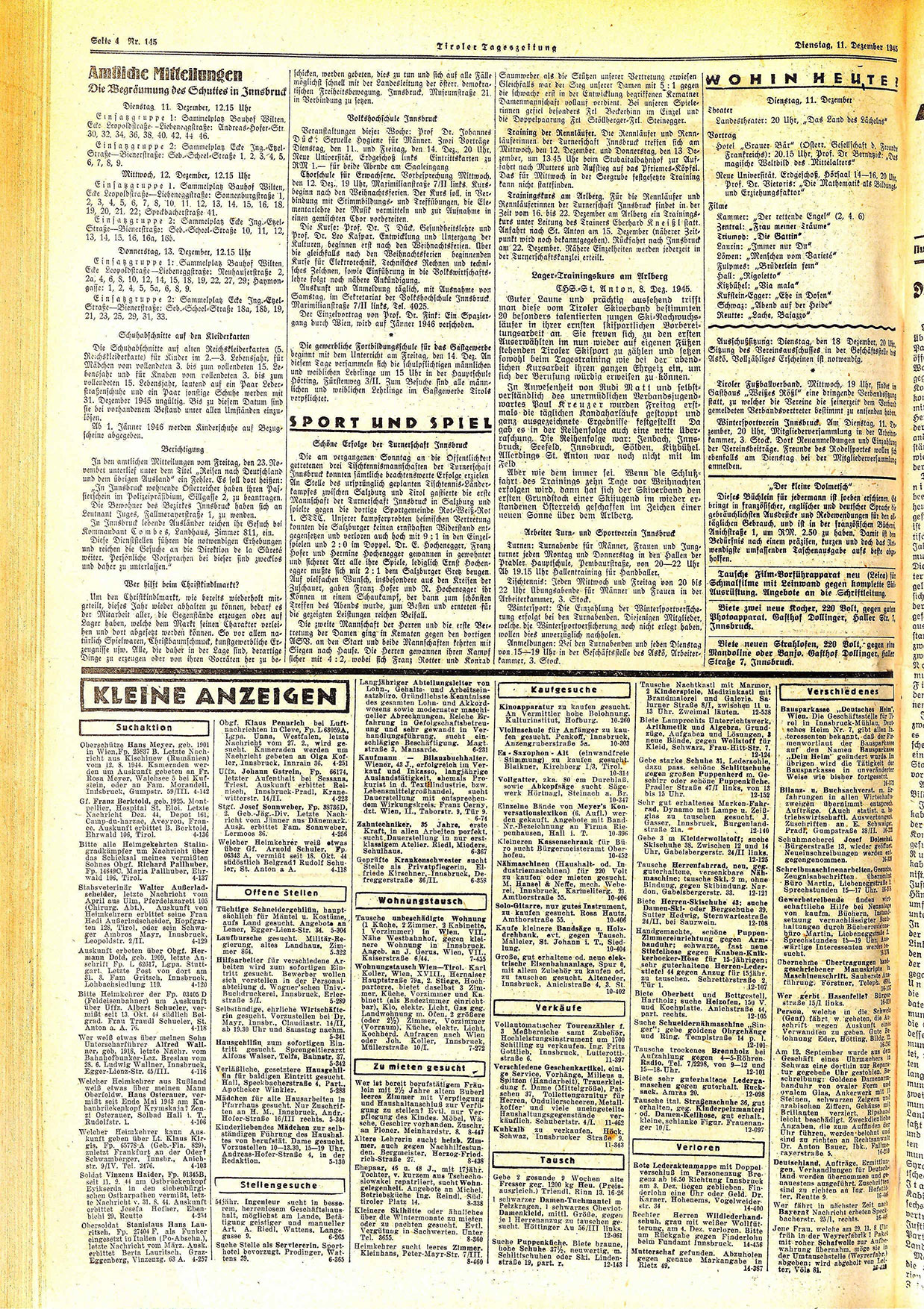 Oberschütze Hans Meyer, geb. 1901 in Wien, Fp. 25837 B. Letzte Nachricht aus Kischinew (Rumänien) vom 12. 8. 1944. Kameraden werden um Auskunft gebeten an Fr. Rosa Meyer, Walchsee 5 bei Kufstein, oder an Fam. Morandell, Innsbruck, Gumpstr. 59/III. 4-142 Gf. Franz Berktold, geb. 1925. Montpellier, Hospital St. Eloi. Letzte Nachricht Dez. 44, Depot 161, Camp-du-harzac, Aveyron, France. Auskunft erbittet B. Berktold, Ehrwald 106, Tirol. 4-136